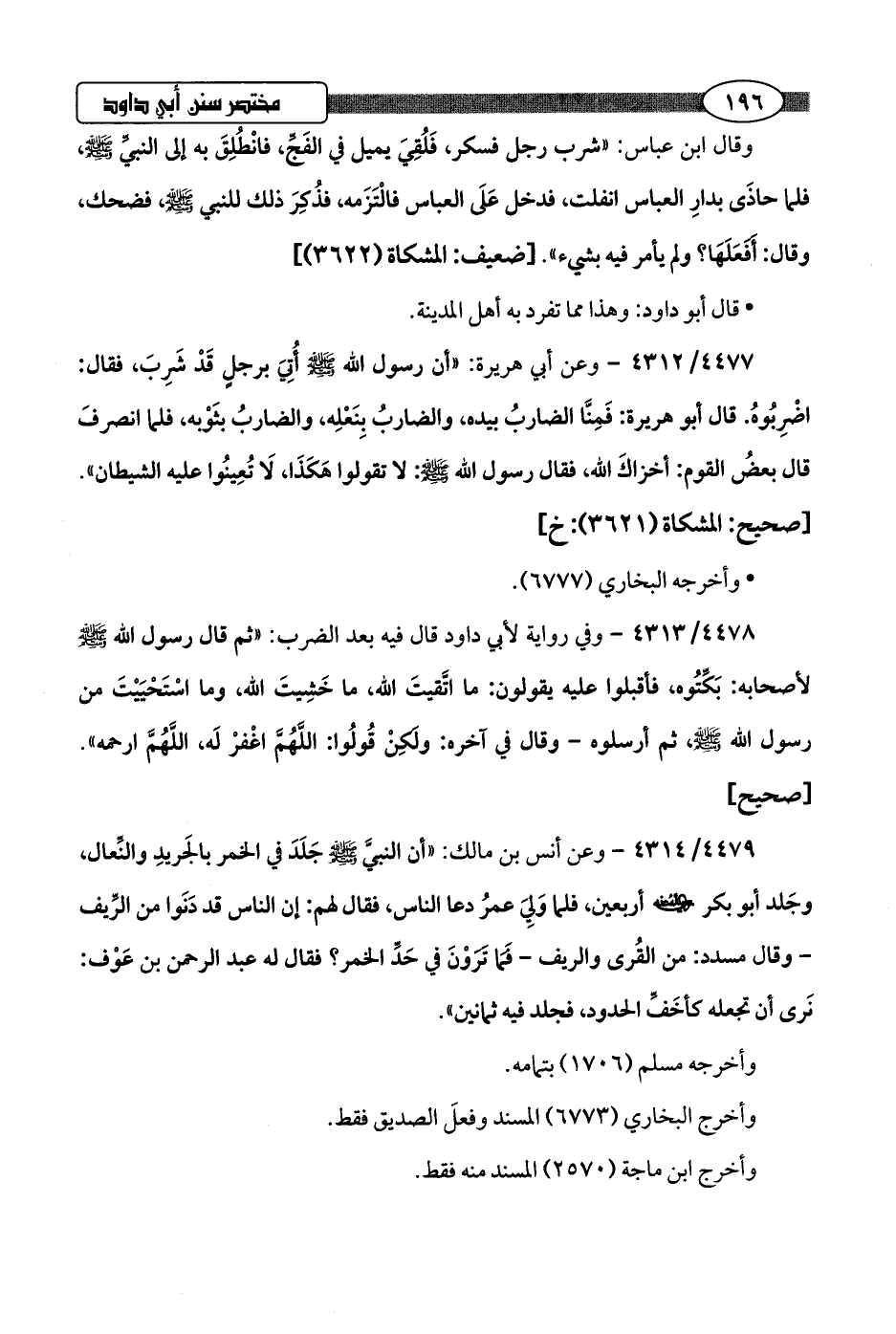 4479/ 4314 - وعن أنس بن مالك: "أن النبيَّ -صلى اللَّه عليه وسلم- جَلَدَ في الخمر بالجَريدِ والنِّعال، وجَلد أبو بكر -رضي اللَّه عنه- أربعين، فلما وَلِيَ عمرُ دعا الناس، فقال لهم: إن الناس قد دَنَوا من الرِّيف -وقال مسدد: من القُرى والريف- فما ترَوْنَ في حَدِّ الخمر؟ فقال له عبد الرحمن بن عَوْف: نَرى أن تجعله كأخَفِّ الحدود، فجلد فيه ثمانين".