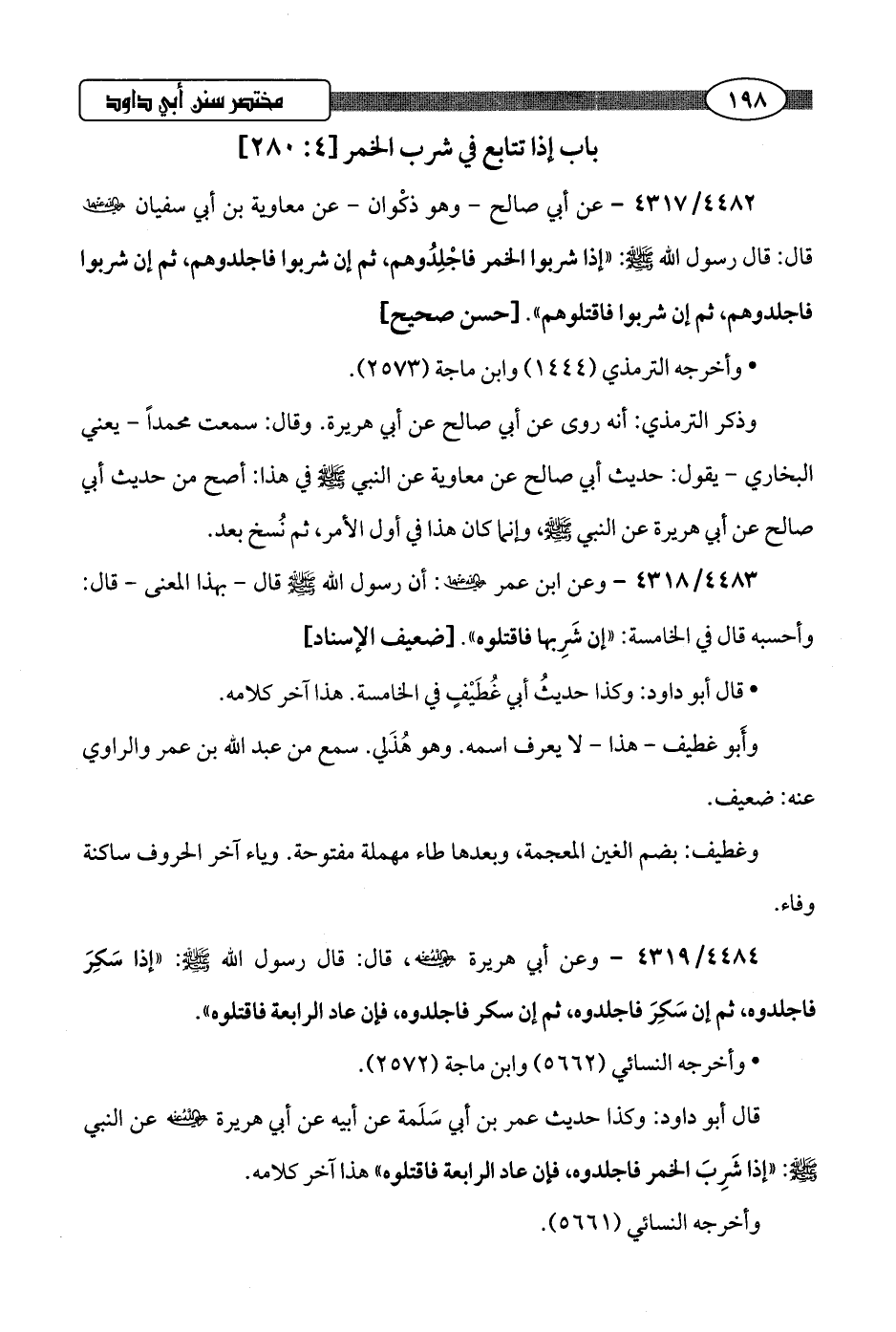 4484/ 4319 - وعن أبي هريرة -رضي اللَّه عنه-، قال: قال رسول اللَّه -صلى اللَّه عليه وسلم-: "إذا سَكِرَ فاجلدوه، ثم إن سَكِرَ فاجلدوه، ثم إن سكر فاجلدوه، فإن عاد الرابعة فاقتلوه".