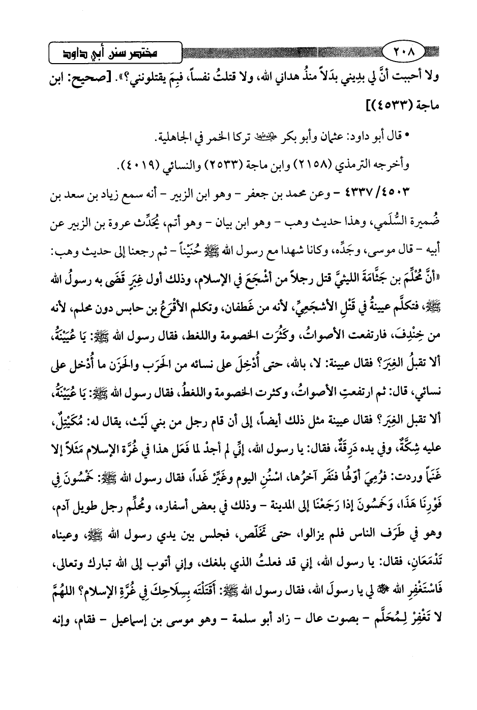 4503/ 4337 - وعن محمد بن جعفر -وهو ابن الزبير- أنه سمع زياد بن سعد بن ضُميرة السُّلَمي، وهذا حديث وهب -وهو ابن بيان- وهو أتم، يحدِّث عروة بن الزبير عن أبيه -قال موسى، وجَدِّه، وكانا شهدا مع رسول اللَّه -صلى اللَّه عليه وسلم- حُنينًا- ثم رجعنا إلى حديث وهب: "أنَّ مُحْلِّمَ بن جَثَّامَةَ الليثيَّ قتل رجلًا من أشْجَعَ في الإسلام، وذلك أول غِيَرٍ قَضَى به رسولُ اللَّه -صلى اللَّه عليه وسلم-، فتكلَّم عيينةُ في قَتْلِ الأشجَعِيِّ، لأنه من غَطفان، وتكلم الأقْرَعُ بن حابس دون محلم، لأنه من خِنْدِفَ، فارتفعت الأصواتُ، وكثُرَت الخصومة واللغط، فقال رسول اللَّه -صلى اللَّه عليه وسلم-: يَا عُيَيْنَةُ، ألا تقبلُ الغِيَرَ؟ فقال عيينة: لا، باللَّه، حتى أُدخِلَ على نسائه من الحَرَب والحَزَن ما أُدْخل على نسائي، قال: ثم ارتفعتِ الأصواتُ، وكثرت الخصومة واللغطُ، فقال رسول اللَّه -صلى اللَّه عليه وسلم-: يَا عُيَيْنَةُ، ألا تقبل الغِيَر؟ فقال عيينة مثل ذلك أيضًا، إلى أن قام رجل من بني لَيْث، يقال له: مُكَيْتِلٌ، عليه شِكَّةٌ، وفي يده دَرِقَةٌ، فقال: يا رسول اللَّه، إني لم أجدْ لما فَعَل هذا في غرَّة الإسلام مَثَلًا إلا غَنَمًا وردت: فرُمِيَ أوّلهُا فنَفَر آخرُها، اسْنُنِ اليوم وغَيِّرْ غَدًا، فقال رسول اللَّه -صلى اللَّه عليه وسلم-: خَمْسُونَ فِي فَوْرِنَا هَذَا، وَخَمسُونَ إذا رَجَعنَا إلى المدينة -وذلك في بعض أسفاره، ومُحلِّم رجل طويل آدم، وهو في طَرَف الناس فلم يزالوا، حتى تَخَلّص، فجلس بين يدي رسول اللَّه -صلى اللَّه عليه وسلم-، وعيناه تَدْمَعَانِ، فقال: يا رسول اللَّه، إني قد فعلتُ الذي بلغك، وإني أتوب إلى اللَّه تبارك وتعالى، فَاسْتَغْفِرِ اللَّه عز وجل لي يا رسولَ اللَّه، فقال رسول اللَّه -صلى اللَّه عليه وسلم-: أقَتَلْتَه بِسِلَاحِكَ فِي غُرَّةِ الإسلام؟ اللَّهُمَّ لا تَغْفِر لِمُحَلَّم -بصوت عال- زاد أبو سلمة -وهو موسى بن إسماعيل- فقام، وإنه