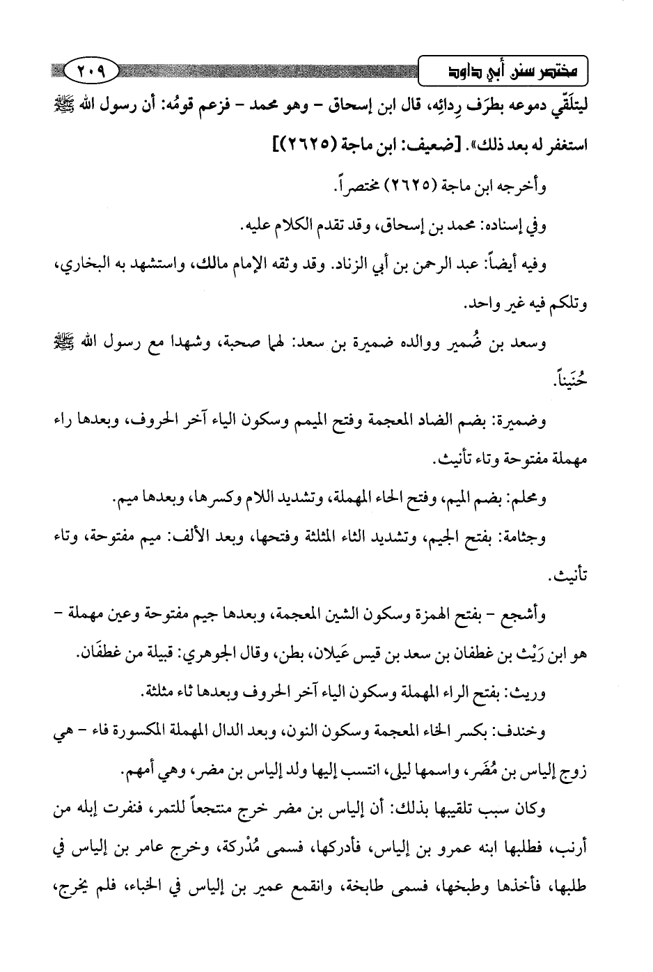 ليتلَقّي دموعه بطرَف رِدائِه، قال ابن إسحاق -وهو محمد- فزعم قومُه: أن رسول اللَّه -صلى اللَّه عليه وسلم- استغفر له بعد ذلك".hضعيف: ابن ماجة (2625)]
