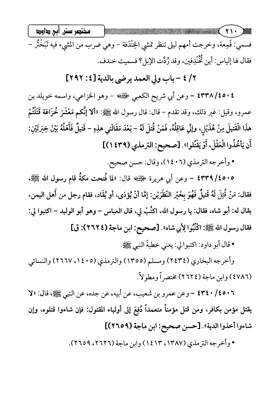 4505/ 4339 - وعن أبي هريرة -رضي اللَّه عنه- قال: "لما فُتحت مكةُ قام رسول اللَّه -صلى اللَّه عليه وسلم-، فقال: مَنْ قُتِلَ لَهُ قَتيل فَهُوَ بِخَيْر النّظَرَيْن: إمَّا أنْ يُؤدَى، أو يُقَاد، فقام رجل من أَهل اليمن، يقال له: أبو شاه، فقال: يا رسول اللَّه، اكتُبْ لي، قال العباس -وهو أبو الوليد- اكتبوا لي: فقال رسول اللَّه -صلى اللَّه عليه وسلم-: اكْتُبُوا لأبي شاه".hصحيح: ابن ماجة (2624): ق]