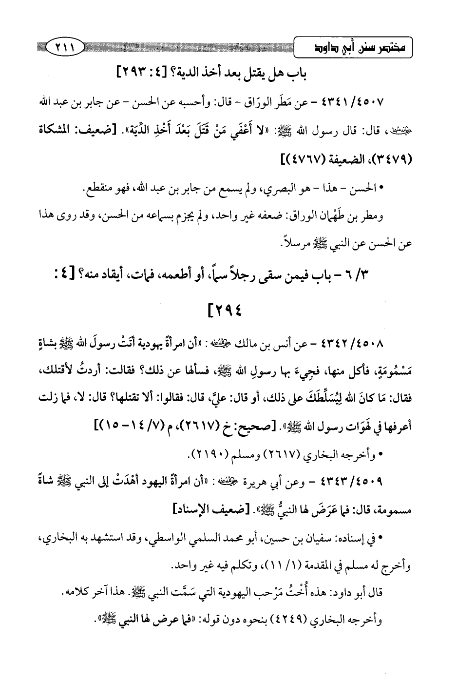4509/ 4343 - وعن أبي هريرة -رضي اللَّه عنه-: "أن امرأةً اليهود أهْدَتْ إلى النبي -صلى اللَّه عليه وسلم- شاةً مسمومة، قال: فما عَرَضَ لها النبيُّ -صلى اللَّه عليه وسلم-".hضعيف الإسناد]