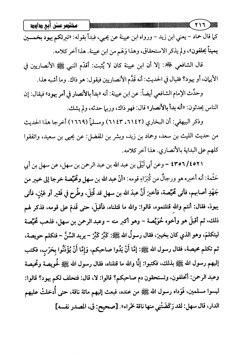 4521/ 4356 - وعن أبي لَيْلَى بن عبد اللَّه بن عبد الرحمن بن سهل، عن سهل بن أبي حَثْمة: أنه أخبره هو ورجال من كُبَرَاءِ قومه: "أنّ عبد اللَّه بن سهل ومُحَيِّصة خرجا إلى خيبر من جَهْدٍ أصابهم، فأتى مُحَيِّصة، فأخبرَ أَنَّ عبدَ اللَّه بن سهل قد قُتِلَ، وطُرح في فَقير أو عَيْنٍ، فأتى يهودَ، فقال: أنتم واللَّهِ قتلتموه، قالوا: واللَّه ما قتلناه، فأقبلَ، حتى قَدمَ على قومه، فذكر لهم ذلك، ثم أقبلَ هو وأخوه حُوَيِّصة -وهو أكبر منه- وعبد الرحمن بن سهل، فذهب مُحَيِّصة ليتكلمَ، وهو الذي كان بخيبرَ، فقال رسولُ اللَّه -صلى اللَّه عليه وسلم-: كَبِّرْ كَبِّرْ -يريد السِّنَّ- فتكلم حويصة، ثم تكلم محيصة، فقال رسول اللَّه -صلى اللَّه عليه وسلم-: إمَّا أَنْ يَدُوا صاحبكم، وإمَّا أَنْ يُؤْذَنُوا بِحَرْبٍ، فكتب إليهم رسول اللَّه -صلى اللَّه عليه وسلم- بذلك، فكتبوا: إنَّا واللَّه ما قتلناه، فقال رسول اللَّه -صلى اللَّه عليه وسلم- لحُويصة ومُحيصة وعبد الرحمن: أتحلفون، وتستحقون دم صاحبكم؟ قالوا: لا، قال: فتحلف لكم يهود؟ قالوا: ليسوا مسلمين، فَوَداه رسول اللَّه -صلى اللَّه عليه وسلم- من عنده، فبعث إليهم مائة ناقة، حتى أُدخلتْ عليهم الدار، قال سهل: لقد رَكَضَتْنِي منها ناقة حَمْراء".hصحيح: ق، المصدر نفسه]