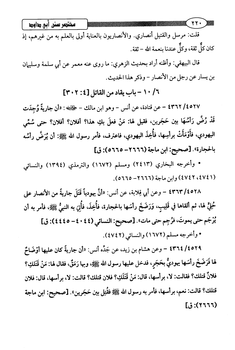 4529/ 4364 - وعن هشام بن زيد، عن جَدِّه أنس: "أن جاريةً كان عليها أوْضَاحٌ لها فَرَضَخَ رأسَها يهوديُّ بحَجَر، فدخل عليها رسول اللَّه -صلى اللَّه عليه وسلم-، وبها رَمَق، فقال لها: مَنْ قَتَلكِ؟ فلان قتلك؟ فقالت: لا، برأسها، قال: مَن قتلَكِ؟ فلان قتلك؟ قالت: لا، برأسها، قال: فلان قتلك؟ قالت: نعم، برأسها، فأمر به رسول اللَّه -صلى اللَّه عليه وسلم- فقُتِل بين حَجَرين".hصحيح: ابن ماجة (2666): ق]