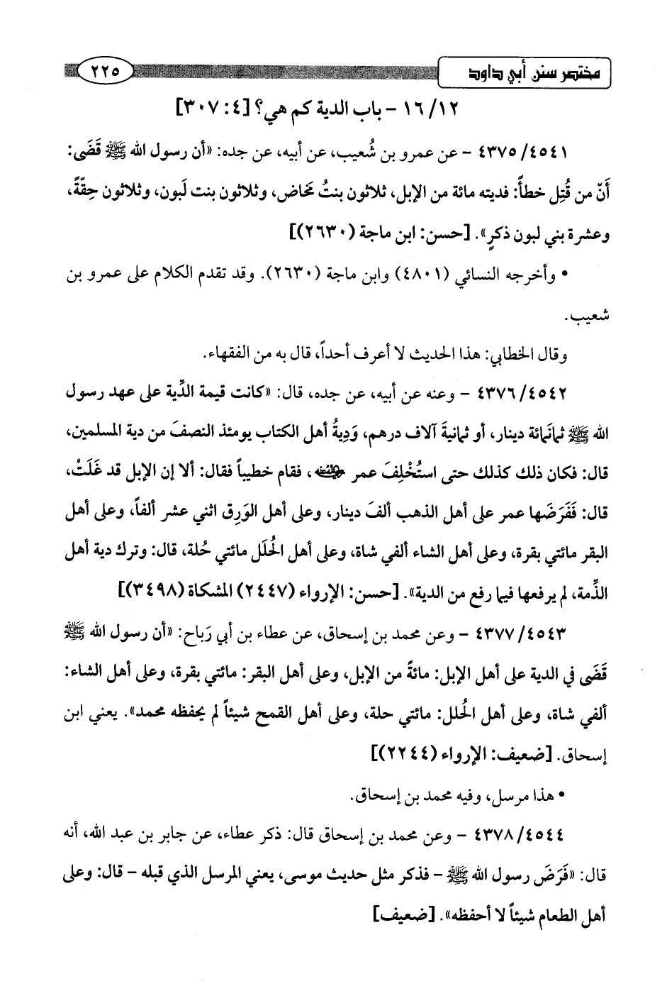 4542/ 4376 - وعنه عن أبيه، عن جده، قال: "كانت قيمة الدِّية على عهد رسول اللَّه -صلى اللَّه عليه وسلم- ثمانَمائة دينار، أو ثمانيةَ آلاف درهم، وَدِيةُ أهل الكتاب يومئذ النصفَ من دية المسلمين، قال: فكان ذلك كذلك حتى استُخْلِفَ عمر -رضي اللَّه عنه-، فقام خطيبًا فقال: ألا إن الإبل قد غَلَتْ، قال: فَفَرَضَها عمر على أهل الذهب ألفَ دينار، وعلى أهل الوَرِق اثني عشر ألفًا، وعلى أهل البقر مائتي بقرة، وعلى أهل الشاء ألفي شاة، وعلى أهل الحُلَل مائتي حُلة، قال: وترك دية أهل الذِّمة، لم يرفعها فيما رفع من الدية".hحسن: الإرواء (2447) المشكاة (3498)]