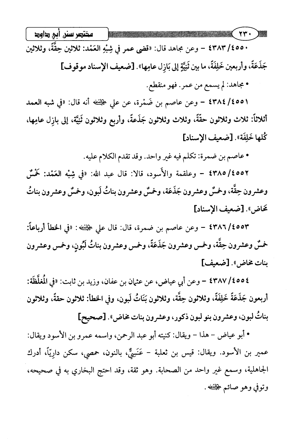 4550/ 4383 - وعن مجاهد قال: "قضى عمر في شِبْهِ العَمد: ثلاثين حِقَّةً، وثلاثين جَذَعَةً، وأربعين خَلِفَةً، ما بين ثَنِيَّةٍ إلى بَازِل عامِها".hضعيف الإسناد موقوف]