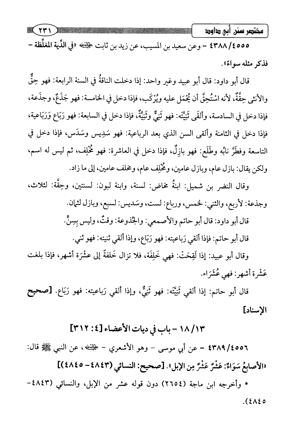 قال أبو داود: قال أبو عبيد وغير واحد: إذا دخلت الناقةُ في السنة الرابعة: فهو حِقٌّ والأنثى حِقَّةٌ، لأنه اسْتُحِقَّ أن يُحْمَل عليه ويُرْكَب، فإذا دخل في الخامسة: فهو جَذَعٌ، وجذَعة، فإذا دخل في السادسة، وألقَى ثَنِيَّتَه: فهو ثَنِيٌّ وثَنِيَّةٌ، فإذا دخل في السابعة: فهو رَبَاع وَرَبَاعية، فإذا دخل في الثامنة وألقى السن الذي بعد الرباعية: فهو سَدِيس وسَدَس، فإذا دخل في التاسعة وفطَرَّ نابُه وطَلَع: فهو بازِل، فإذا دخل في العاشرة: فهو مُخْلِف، ثم ليس له اسم، ولكن يقال: بازل عام، وبازل عامين، ومُخْلِف عام، ومخلف عامين، إلى ما زاد.