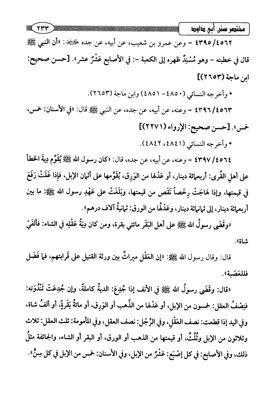 4562/ 4395 - وعن عمرو بن شعيب، عن أبيه، عن جده -رضي اللَّه عنهما-: "أن النبي -صلى اللَّه عليه وسلم- قال في خطبته -وهو مُسْنِدٌ ظهره إلى الكعبة-: في الأصابع عَشْرٌ عشر".hحسن صحيح: ابن ماجة (2653)]