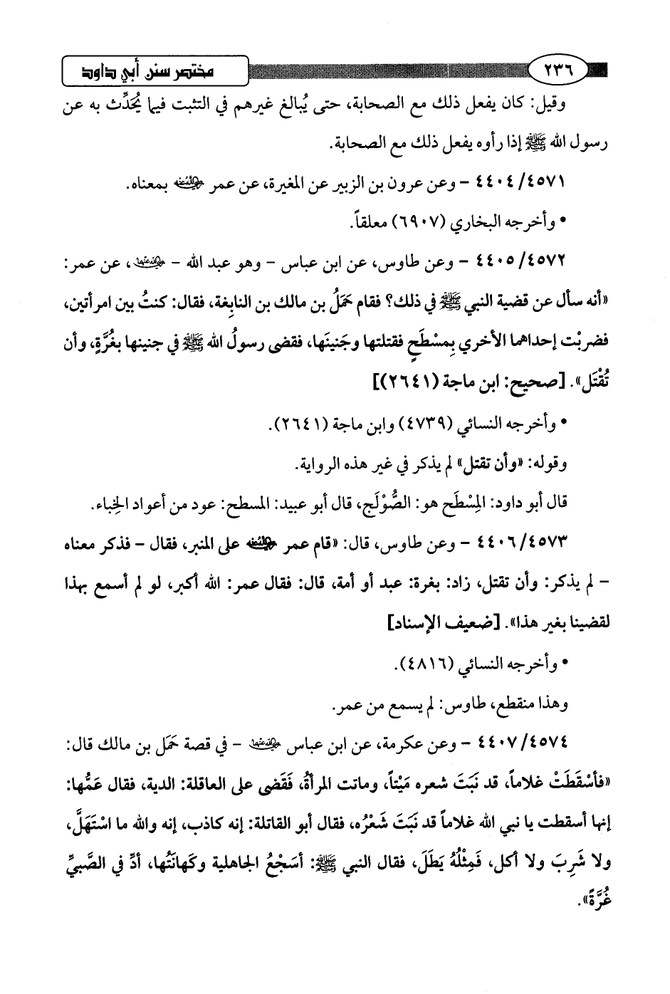 4574/ 4407 - وعن عكرمة، عن ابن عباس -رضي اللَّه عنهما- في قصة حَمَل بن مالك قال: "فأسقَطَتْ غلامًا، قد نبَتَ شعره مَيْتًا، وماتت المرأة، فَقضى على العاقلة: الدية، فقال عَمُّها: إنها أسقطت يا نبي اللَّه غلامًا قد نبَتَ شعرُه، فقال أبو القاتلة: إنه كاذب، إنه واللَّه ما استَهلَّ، ولا شَرِبَ ولا أكل، فَمِثْلُهُ يَطَلَ، فقال النبي -صلى اللَّه عليه وسلم-: أسجْعُ الجاهلية وكَهانَتُها، أدِّ في الصَّبيِّ غُرَّةً".