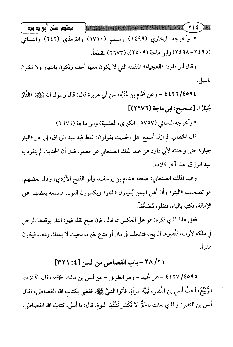 وقال أبو داود: "العجماء" المنفلتة التي لا يكون معها أحد، وتكون بالنهار ولا تكون بالليل.