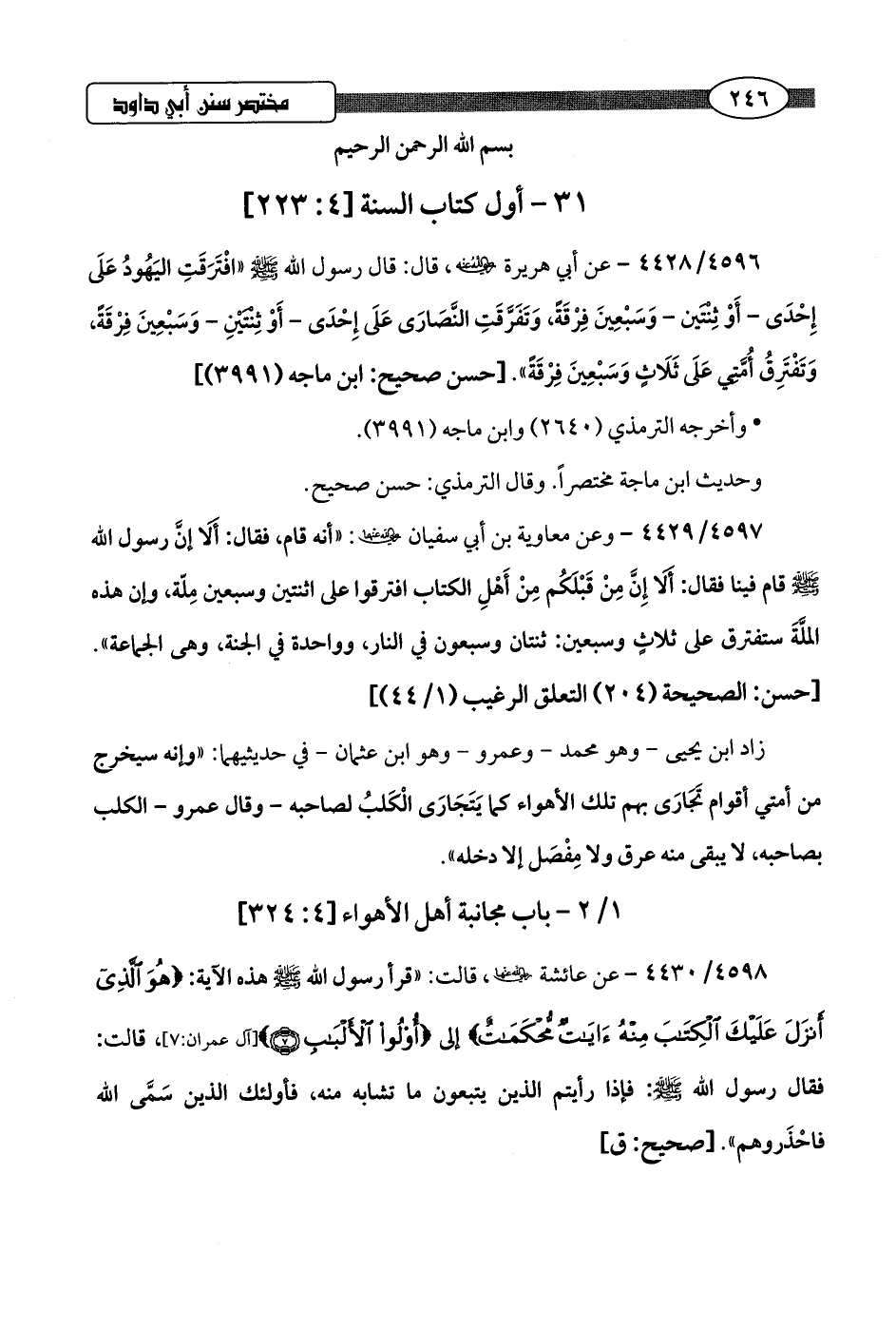 4596/ 4428 - عن أبي هريرة -رضي اللَّه عنه-، قال: قال رسول اللَّه -صلى اللَّه عليه وسلم- "افْتَرَقَتِ اليَهُودُ عَلَى إِحدَى -أَوْ ثِنْتَين- وَسَبْعِينَ فِرْقَةً، وَتَفَرَّقَتِ النَّصَارَى عَلَى إِحدَى -أَوْ ثِنْتَينِ- وَسَبْعِينَ فِرْقَةً، وَتَفْتَرِقُ أُمَّتي عَلَى ثَلَاثٍ وَسبْعِينَ فِرْقَةً".hحسن صحيح: ابن ماجه (3991)]