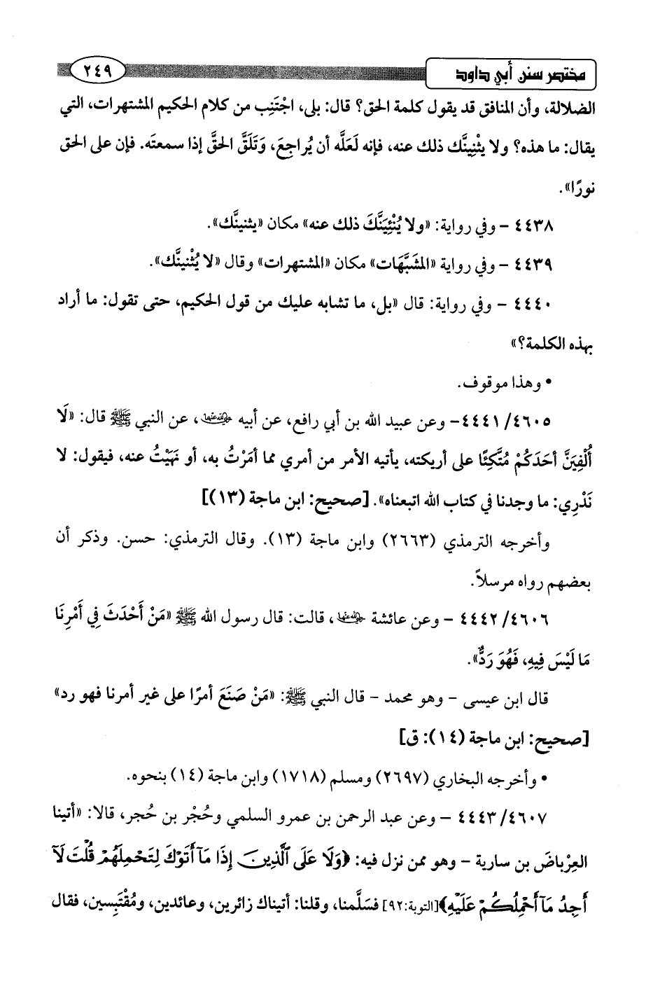 4605/ 4441 - وعن عبيد اللَّه بن أبي رافع، عن أبيه -رضي اللَّه عنهما-، عن النبي -صلى اللَّه عليه وسلم- قال: "لَا أُلْفِيَنَّ أحَدَكُمْ مُتَّكِئًا على أريكته، يأتيه الأمر من أمري مما أمَرْتُ به، أو نَهَيْتُ عنه، فيقول: لا نَدْرِي: ما وجدنا في كتاب اللَّه اتبعناه".hصحيح: ابن ماجة (13)]
