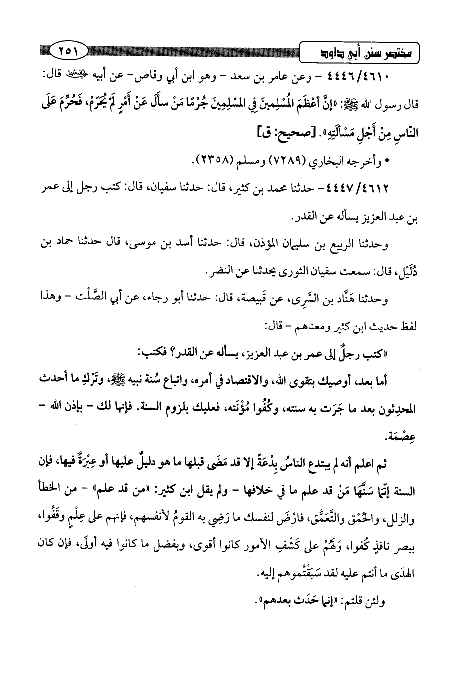 4610/ 4446 - وعن عامر بن سعد -وهو ابن أبي وقاص- عن أبيه -رضي اللَّه عنهما- قال: قال رسول اللَّه -صلى اللَّه عليه وسلم-: "إنَّ أعْظَمَ المُسْلِمينَ فِي المسْلِمِينَ جُرْمًا مَنْ سأَلَ عَنْ أَمْرٍ لَم يُحَرّمْ، فَحُرِّمَ عَلَى النّاسِ مِنْ أَجْلِ مَسْألَتِهِ".hصحيح: ق]