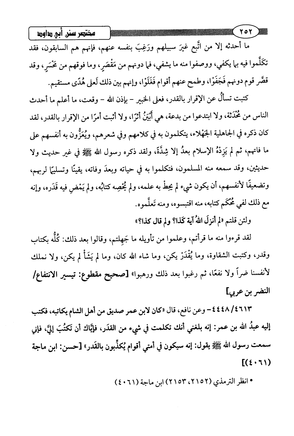 4613/ 4448 - وعن نافع، قال "كان لابن عمر صديق من أهل الشام يكاتبه، فكتب إليه عبدُ اللَّه بن عمر: إنه بلغني أنك تكلمت في شيء من القدَر، فإيَّاك أن تكتُبَ إليَّ، فإني سمعت رسول اللَّه -صلى اللَّه عليه وسلم- يقول: إنه سيكون في أمتي أقوام يُكذِّبون بالقَدر".hحسن: ابن ماجة (4061)]