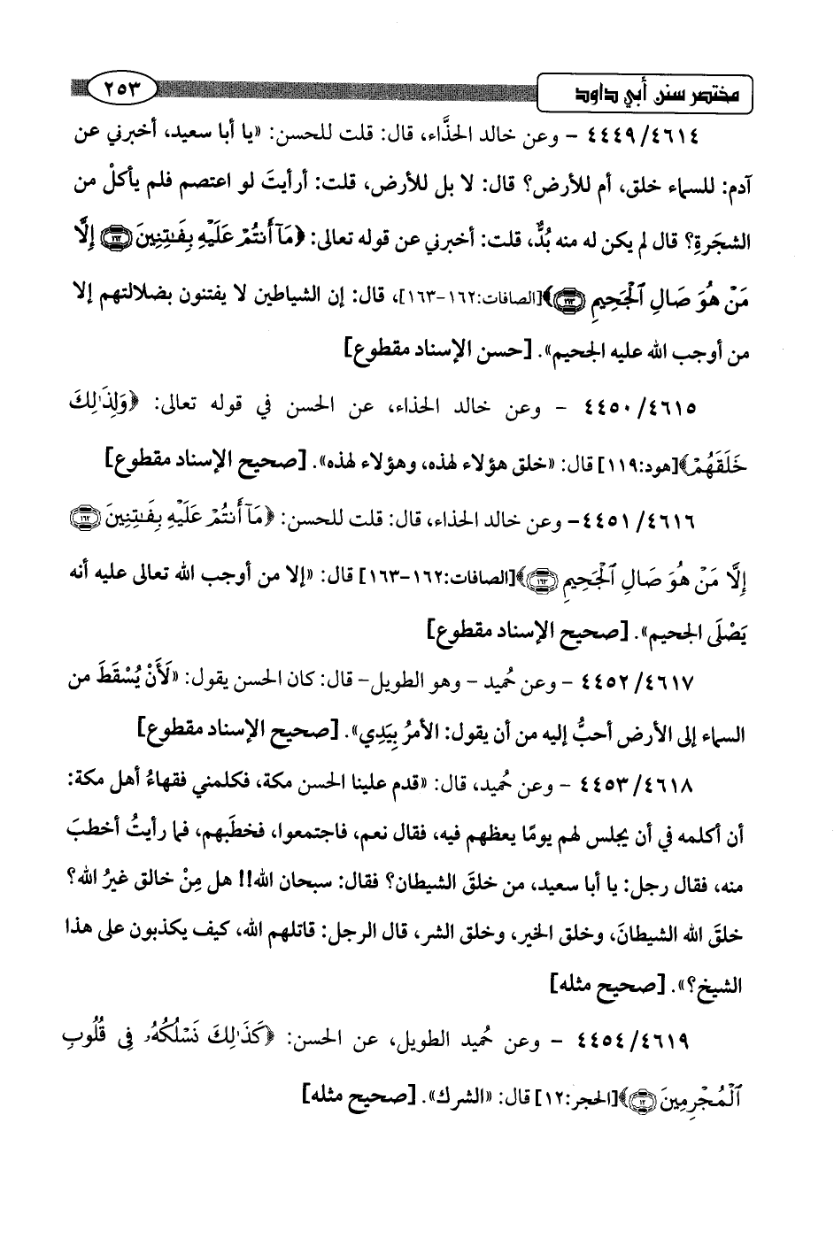 4616/ 4451 - وعن خالد الحذاء، قال: قلت للحسن: {مَا أَنْتُمْ عَلَيْهِ بِفَاتِنِينَ (162) إِلَّا مَنْ هُوَ صَالِ الْجَحِيمِ (163)} [الصافات: 162 - 163]، قال: "إلا من أوجب اللَّه تعالى عليه أنه يَصْلَى الجحيم".hصحيح الإسناد مقطوع]