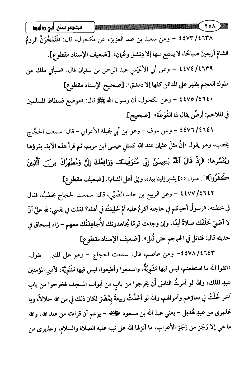 4638/ 4473 - وعن سعيد بن عبد العزيز، عن مكحول، قال: "لتَمخُرَنَّ الرومُ الشامَ أربعينَ صباحا، لا يمتنع منها إلا دِمَشق وعُمان".hضعيف الإسناد مقطوع]