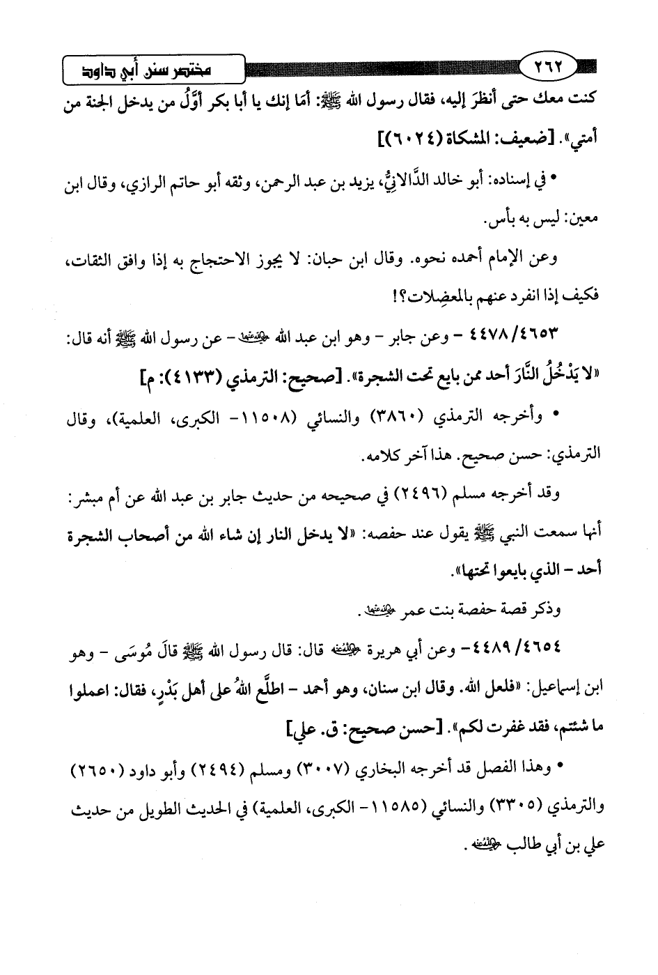 4653/ 4478 - وعن جابر -وهو ابن عبد اللَّه -رضي اللَّه عنه- عن رسول اللَّه -صلى اللَّه عليه وسلم- أنه قال: "لا يَدْخُلُ النارَ أحد ممن بايع تحت الشجرة".hصحيح: الترمذي (4133): م]
