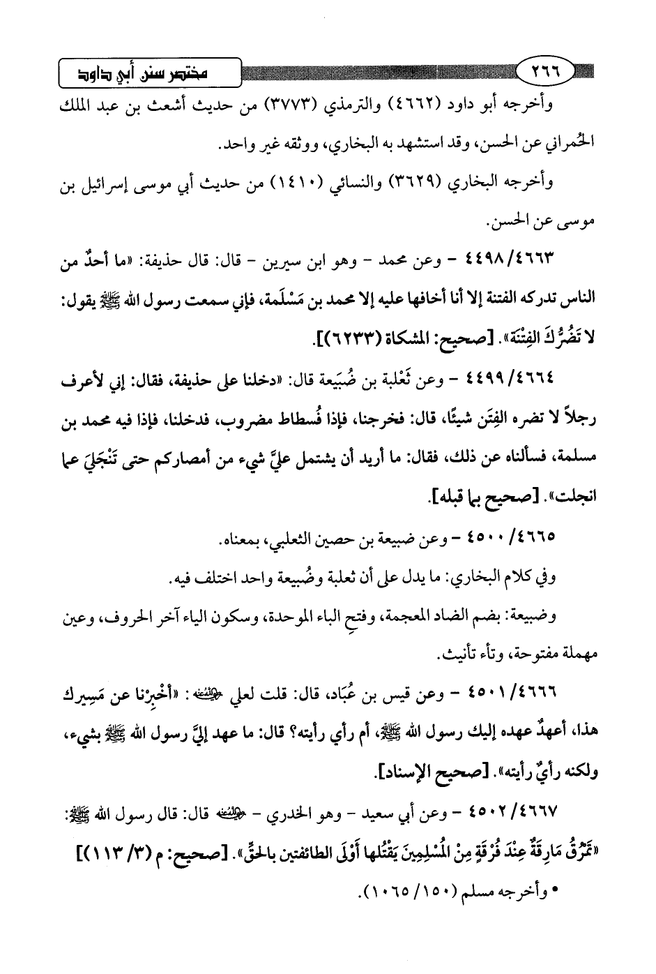 4663/ 4498 - وعن محمد -وهو ابن سيرين- قال: قال حذيفة: "ما أحدٌ من الناس تدركه الفتنة إلا أنا أخافها عليه إلا محمد بن مَسْلَمة، فإني سمعت رسول اللَّه -صلى اللَّه عليه وسلم- يقول: لا تَضُرُّكَ الفِتْنَة".hصحيح: المشكاة (6233)].