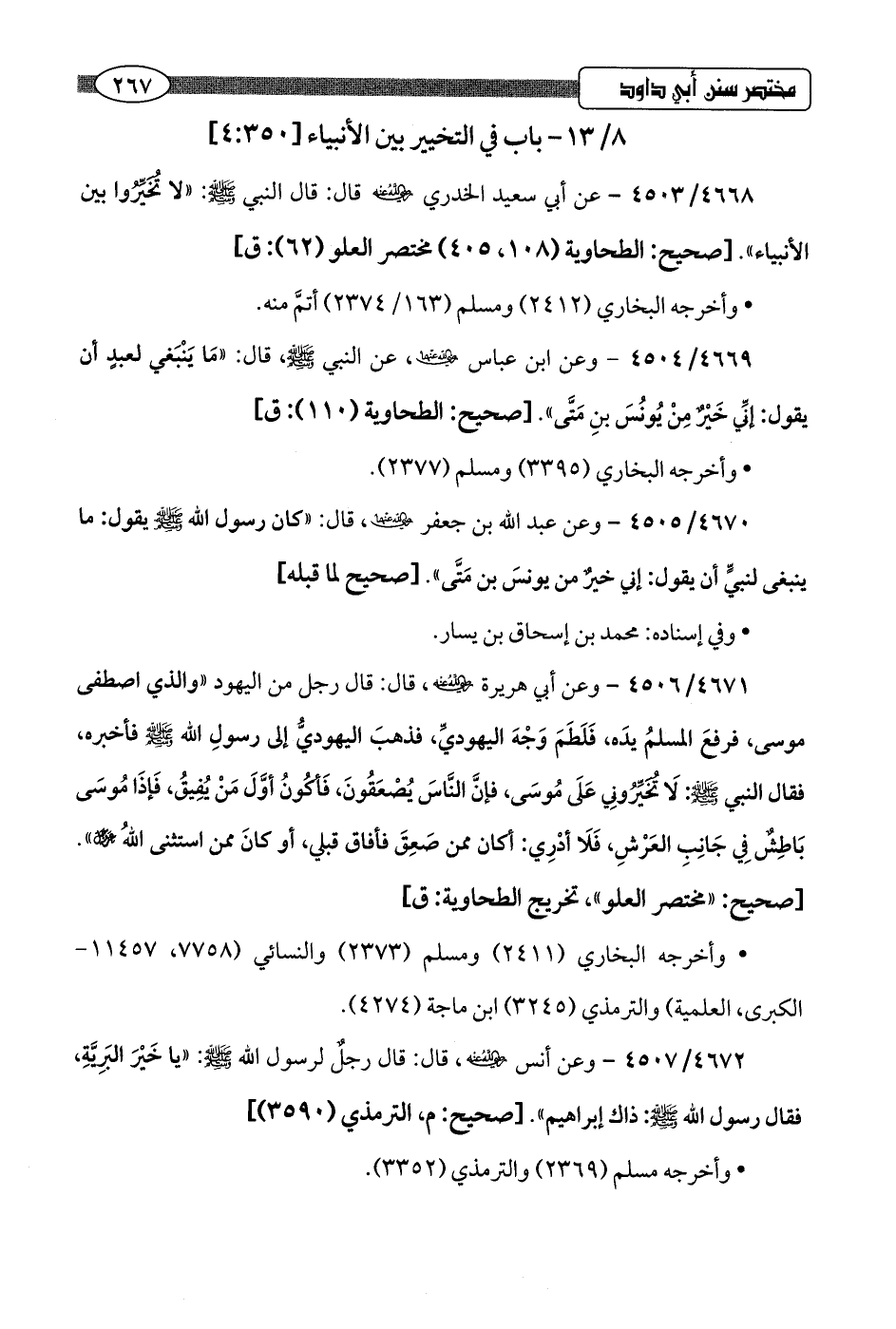 4668/ 4503 - عن أبي سعيد الخدري -رضي اللَّه عنه- قال: قال النبي -صلى اللَّه عليه وسلم-: "لا تُخَيِّرُوا بين الأنبياء".hصحيح: الطحاوية (108، 405) مختصر العلو (62): ق]