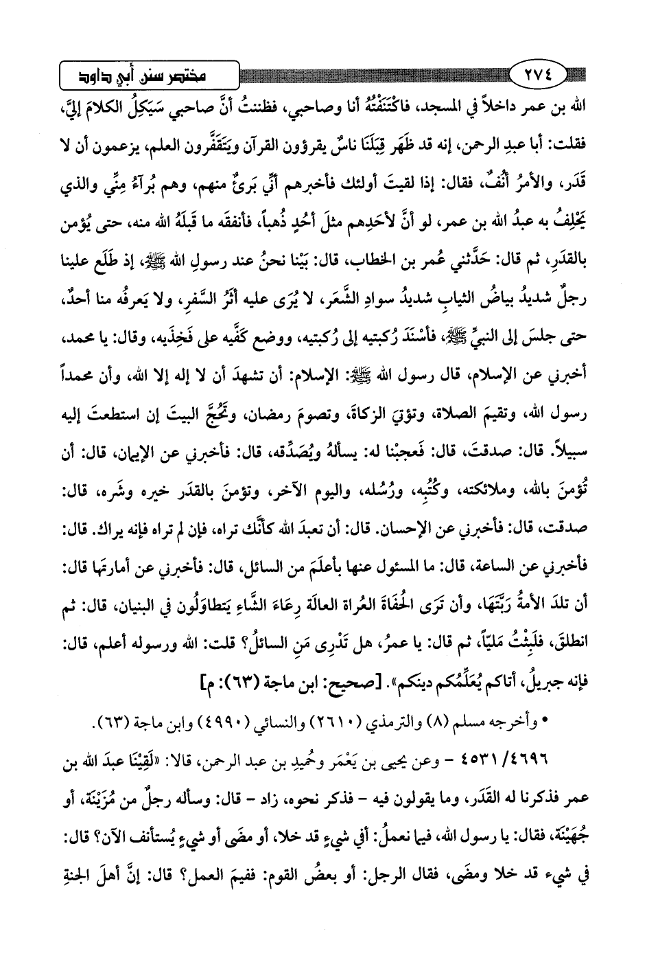 اللَّه بن عمر داخلًا في المسجد، فاكْتَنَفْتُهُ أنا وصاحبي، فظننتُ أنَّ صاحبي سَيَكِلُ الكلامَ إليَّ، فقلت: أبا عبدِ الرحمن، إنه قد ظَهَر قِبَلَنَا ناسٌ يقرؤون القرآن وَيتَقَفَّرون العلم، يزعمون أن لا قَدَر، والأمرُ أنُفٌ، فقال: إذا لقيتَ أولئك فأخبرهم أنِّي بَرئٌ منهم، وهم بُرآءُ مِنِّي والذي يَحْلِفُ به عبدُ اللَّه بن عمر، لو أنَّ لأحَدِهم مثلَ أحُدٍ ذُهبًا، فأنفقَه ما قَبلَهُ اللَّه منه، حتى يُؤمن بالقدَرِ، ثم قال: حَدَّثني عُمر بن الخطاب، قال: بَيْنا نحنُ عند رسولِ اللَّه -صلى اللَّه عليه وسلم-، إذ طَلَع علينا رجلٌ شديدُ بياضُ الثيابِ شديدُ سوادِ الشَّعَر، لا يُرَى عليه أثَرُ السَّفرِ، ولا يَعرفُه منا أحدٌ، حتى جلسَ إلى النبيِّ -صلى اللَّه عليه وسلم-، فأسْنَدَ رُكبتيه إلى رُكبتيه، ووضع كَفَّيه على فَخِذَيه، وقال: يا محمد، أخبرني عن الإسلام، قال رسول اللَّه -صلى اللَّه عليه وسلم-: الإسلام: أن تشهدَ أن لا إله إلا اللَّه، وأن محمدًا رسول اللَّه، وتقيمَ الصلاة، وتؤتيَ الزكاةَ، وتصومَ رمضان، وتَحُجَّ البيتَ إن استطعتَ إليه سبيلًا. قال: صدقتَ، قال: فَعجبْنا له: يسألهُ ويُصَدِّقه، قال: فأخبرني عن الإيمان، قال: أن تُؤمنَ باللَّه، وملائكته، وكُتُبِه، ورُسُله، واليوم الآخر، وتؤمنَ بالقدَر خيره وشَره، قال: صدقت، قال: فأخبرني عن الإحسان. قال: أن تعبدَ اللَّه كأنَّك تراه، فإن لم تراه فإنه يراك. قال: فأخبرني عن الساعة، قال: ما المسئول عنها بأعلَمَ من السائل، قال: فأخبرني عن أمارتَها قال: أن تلدَ الأمةُ رَبَّتَهَا، وأن ترَى الحُفَاةَ العُراة العالَة رِعَاءَ الشَّاءِ يَتطاوَلُون في البنيان، قال: ثم انطلقَ، فلَبِثْتُ مَليًّا، ثم قال: يا عمرُ، هل تَدْرِى مَنِ السائلُ؟ قلت: اللَّه ورسوله أعلم، قال: فإنه جبربلُ، أتاكم يُعَلِّمُكم دينَكم".hصحيح: ابن ماجة (63): م]