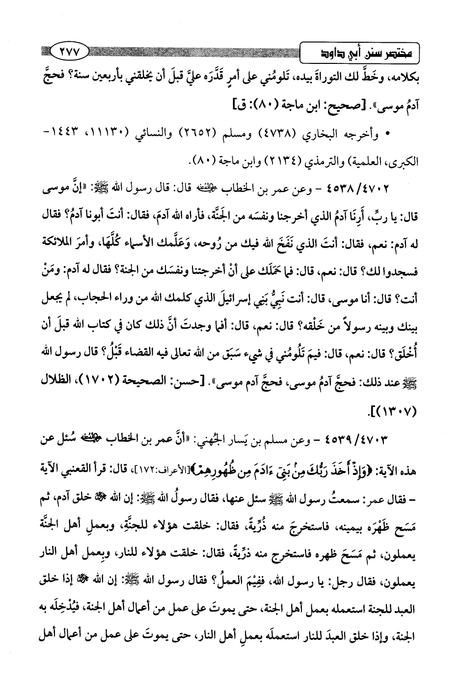 4702/ 4538 - وعن عمر بن الخطاب -رضي اللَّه عنه- قال: قال رسول اللَّه -صلى اللَّه عليه وسلم-: "إنَّ موسى قال: يا ربِّ، أَرِنَا آدمُ الذي أخرجنا ونفسَه من الجَنَّة، فأراه اللَّه آدمَ، فقال: أنتَ أبونا آدمُ؟ فقال له آدم: نعم، فقال: أنتَ الذي نَفَخَ اللَّه فيك من رُوحه، وَعَلَّمك الأسماء كُلَّهَا، وأمرَ الملائكة فسجدوا لك؟ قال: نعم، قال: فما حَمَلَك على أنْ أخرجتنا ونفسَك من الجنة؟ فقال له آدم: ومَنْ أنت؟ قال: أنا موسى، قال: أنت نَبِيُّ بَنِي إسرائيلَ الذي كلمك اللَّه من وراء الحجاب، لم يجعل بينك وبينه رسولًا من خَلْقه؟ قال: نعم، قال: أفما وجدتَ أنَّ ذلك كان في كتاب اللَّه قبلَ أن أُخْلَق؟ قال: نعم، قال: فيمَ تَلُومُني في شيء سَبَق من اللَّه تعالى فيه القضاء قَبْلُ؟ قال رسول اللَّه -صلى اللَّه عليه وسلم- عند ذلك: فحجَّ آدمُ موسى، فحجَّ آدم موسى".hحسن: الصحيحة (1702)، الظلال (1307)]