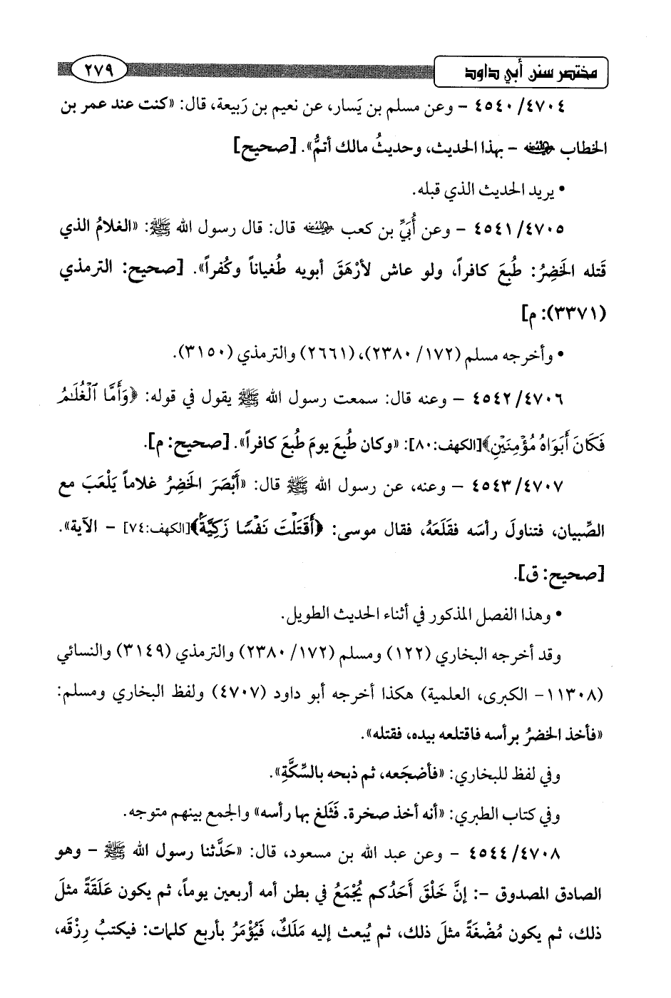 وقد أخرجه البخاري (122) ومسلم (172/ 2380) والترمذي (3149) والنسائي (11308 - الكبرى، العلمية) هكذا أخرجه أبو داود (4757) ولفظ البخاري ومسلم: "فأخذ الخضرُ برأسه فاقتلعه بيده، فقتله".