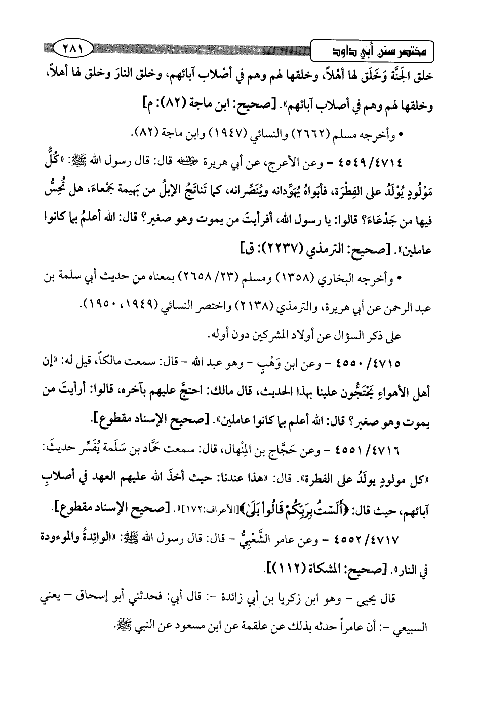 4715/ 4550 - وعن ابن وَهْبٍ -وهو عبد اللَّه- قال: سمعت مالكًا، قيل له: "إن أهل الأهواءِ يَحْتَجُّون علينا بهذا الحديث، قال مالك: احتجَّ عليهم بآخره، قالوا: أرأيتَ من يموت وهو صغير؟ قال: اللَّه أعلم بما كانوا عاملين".hصحيح الإسناد مقطوع].