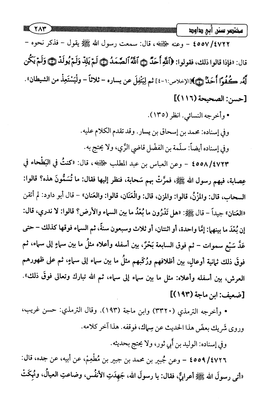 4723/ 4558 - وعن العباس بن عبد المطلب -رضي اللَّه عنه-، قال: "كُنْتُ في البَطْحاء في عِصابة، فيهم رسول اللَّه -صلى اللَّه عليه وسلم-، فمرَّتْ بهم سحابة، فنظر إليها فقال: ما تُسَمُّونَ هذه؟ قالوا: السحاب، قال: والمزْنُ، قالوا: والمزن، قال: والْعَنَان، قالوا: والعَنان" -قال أبو داود: لم أتقن "العَنان" جيدًا- قال -صلى اللَّه عليه وسلم-: "هل تَدْرُون ما بُعْدُ ما بين السماء والأرض؟ قالوا: لا ندري، قال: إن بُعْدَ ما بينهما: إمَّا واحدة، أو اثنتان، أو ثلاث وسبعون سنةً، ثم السماء فوقها كذلك -حتى عَدَّ سَبْع سموات- ثم فوق السابعة بَحْرٌ، بين أسفله وأعلاه مثلُ ما بين سماءٍ إلى سماء، ثم فوقَ ذلك ثمانية أو عالٍ، بين أظلافهم ورُكبهم مثلُ ما بين سماء إلى سماءٍ، ثم على ظهورهم العرش، بين أسفله وأعلاه: مثل ما بين سماء إلى سماء، ثم اللَّه تبارك وتعالى فوقَ ذلك".hضعيف: ابن ماجة (193)]