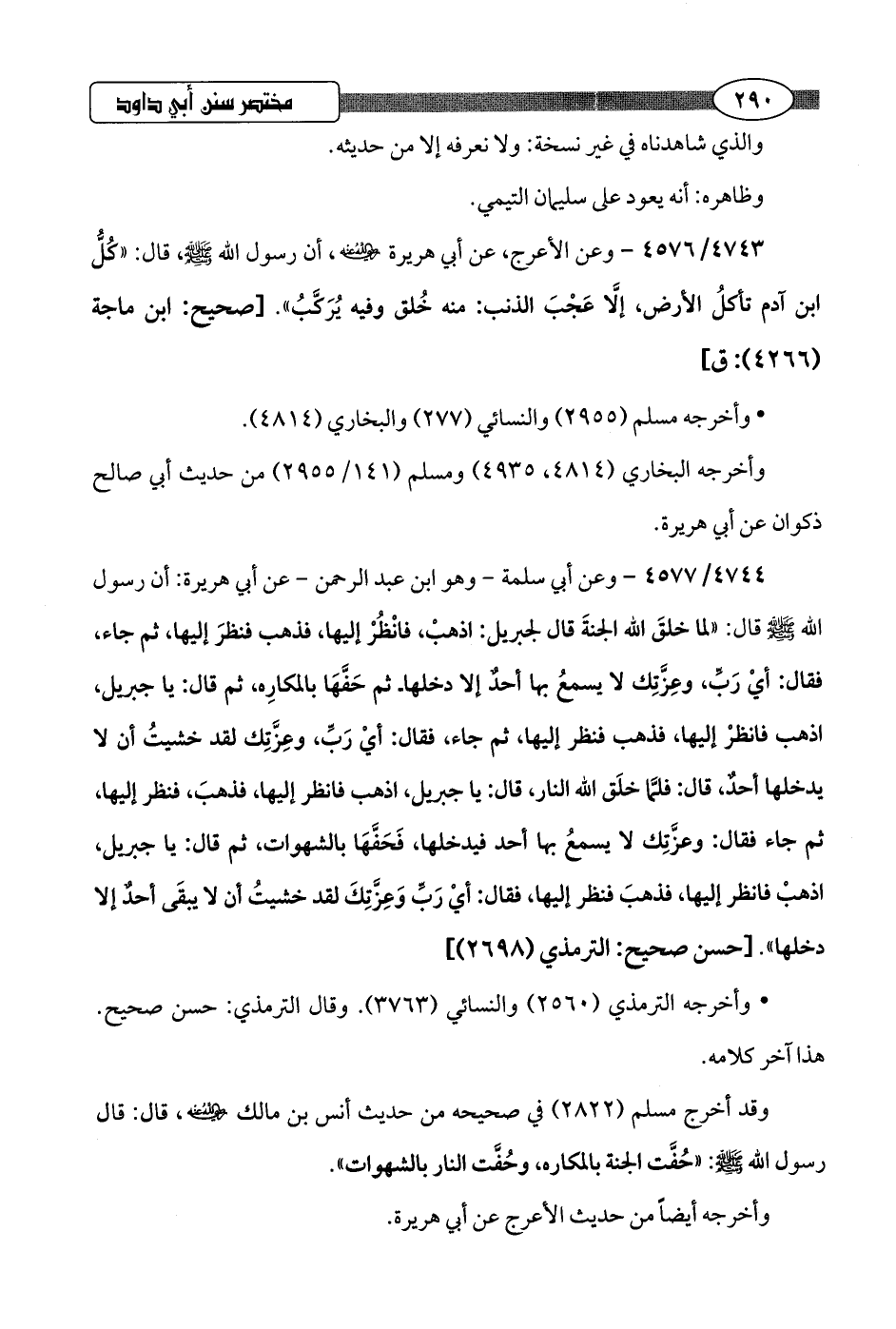 4743/ 4576 - وعن الأعرج، عن أبي هريرة -رضي اللَّه عنه-، أن رسول اللَّه -صلى اللَّه عليه وسلم-، قال: "كُلُّ ابن آدم تأكلُ الأرض، إلَّا عَجْبَ الذنب: منه خُلق وفيه يُرَكَّبُ".hصحيح: ابن ماجة (4266): ق]