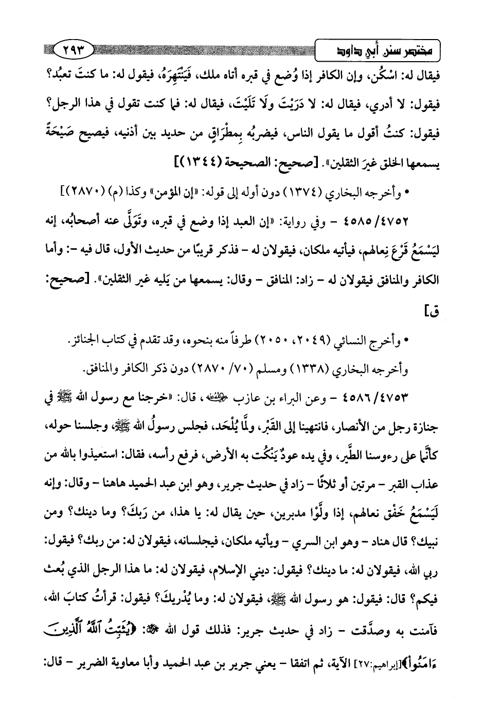 4753/ 4586 - وعن البراء بن عازب -رضي اللَّه عنه-، قال: "خرجنا مع رسول اللَّه -صلى اللَّه عليه وسلم- في جنازة رجل من الأنصار، فانتهينا إلى القَبْر، ولمَّا يُلْحَد، فجلس رسولُ اللَّه -صلى اللَّه عليه وسلم-، وجلسنا حوله، كأنَّما على رءوسنا الطَّير، وفي يده عودٌ يَنْكُت به الأرض، فرفع رأسه، فقال: استعيذوا باللَّه من عذاب القبر -مرتين أو ثلاثًا- زاد في حديث جرير، وهو ابن عبد الحميد ها هنا -وقال: وإنه لَيَسْمَعُ خَفْق نعالهم، إذا ولَّوْا مدبرين، حين يقال له: يا هذا، من رَبكَ؟ وما دينك؟ ومن نبيك؛ قال هناد -وهو ابن السري- ويأتيه ملكان، فيجلسانه، فيقولان له: من ربك؟ فيقول: ربيَّ اللَّه، فيقولان له: ما دينك؟ فيقول: ديني الإسلام، فيقولان له: ما هذا الرجل الذي بُعث فيكم؟ قال: فيقول: هو رسول اللَّه -صلى اللَّه عليه وسلم-، فيقولان له: وما يُدْريكَ؟ فيقول: قرأتُ كتابَ اللَّه، فآمنت به وصدَّقت -زاد في حديث جرير: فذلك قول اللَّه عز وجل: {يُثَبِّتُ اللَّهُ الَّذِينَ آمَنُوا} [إبراهيم: 27]، الآية، ثم اتفقا -يعني جرير بن عبد الحميد وأبا معاوية الضرير- قال:
