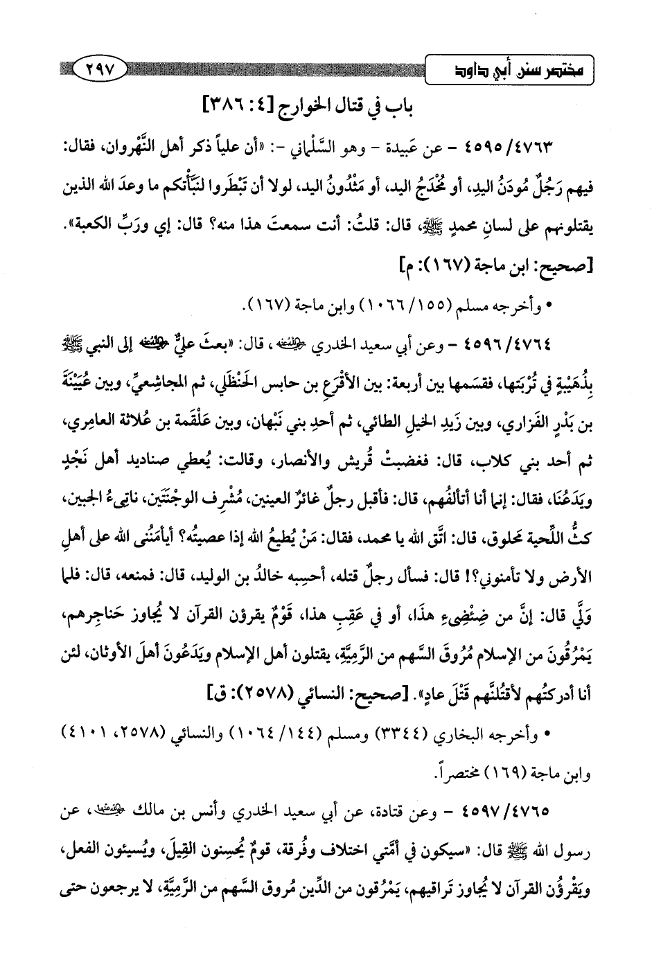 4764/ 4596 - وعن أبي سعيد الخدري -رضي اللَّه عنه-، قال: "بعثَ عليٌّ -رضي اللَّه عنه- إلى النبي -صلى اللَّه عليه وسلم- بِذُهَيْبةٍ في تُرْبَتها، فقسَمها بين أربعة: بين الأقْرَعِ بن حابس الحَنْظَلي، ثم المجاشِعيِّ، وبين عُيَيْنَةَ بن بَدْرٍ الفَزاري، وبين زَيدِ الخيلِ الطائي، ثم أحدِ بني نَبْهان، وبين عَلْقَمة بن عُلاثة العامِري، ثم أحد بني كلاب، قال: فغضبتْ قُريش والأنصار، وقالت: يُعطي صناديد أهل نَجْدٍ ويَدَعُنَا، فقال: إنما أنا أتألفُهم، قال: فأقبل رجلٌ غائرٌ العينين، مُشْرِف الوجْنَتَين، ناتِئُ الجبين، كثُّ اللِّحية مَحلوق، قال: اتَّق اللَّه يا محمد، فقال: مَنْ يُطيعُ اللَّه إذا عصيتُه؟ أيامَنُنى اللَّه على أهلِ الأرض ولا تأمنوني؟ ! قال: فسأل رجلٌ قتله، أحسِبه خالدُ بن الوليد، قال: فمنعه، قال: فلما وَلَّي قال: إنَّ من ضِئْضِئِ هذَا، أو في عَقِبِ هذا، قَوْمٌ يقرؤن القرآن لا يُجاوز حَناجِرهم، يَمْرُقُونَ من الإسلام مُرُوقَ السَّهم من الرَّمِيَّةِ، يقتلون أهل الإسلام وَيدَعُونَ أهلَ الأوثان، لئن أنا أدركتُهم لأقتُلنَّهم قَتْلَ عادٍ".hصحيح: النسائي (2578): ق]