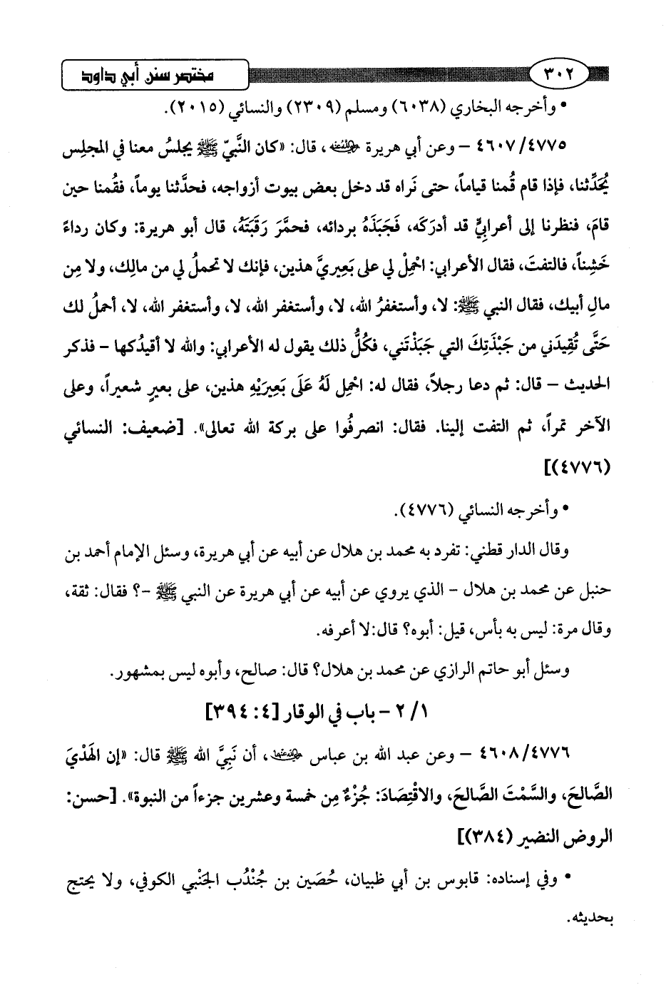 4775/ 4607 - وعن أبي هريرة -رضي اللَّه عنه-، قال: "كان النَّبيّ -صلى اللَّه عليه وسلم- يجلسُ معنا في المجلِس يحدِّثنا، فإذا قام قُمنا قيامًا، حتى نَراه قد دخل بعض بيوت أزواجه، فحدَّثنا يومًا، فقُمنا حين قامَ، فنظرنا إلى أعرابِيٍّ قد أدرَكَه، فَجَبَذَهُ بردائه، فحمَّرَ رَقَبَتَهُ، قال أبو هريرة: وكان رداءً خَشِنًا، فالتفتَ، فقال الأعرابي: احْمِلْ لي على بَعِيريَّ هذين، فإنك لا تحملُ لي من مالِك، ولا مِن مالِ أبيك، فقال النبي -صلى اللَّه عليه وسلم-: لا، وأستغفرُ اللَّه، لا، وأستغفر اللَّه، لا، وأستغفر اللَّه، لا، أحملُ لك حَتَّى تُقِيدَني من جَبْذَتِكَ التي جَبَذْتَني، فكُلُّ ذلك يقول له الأعرابي: واللَّه لا أقيدُكها -فذكر الحديث- قال: ثم دعا رجلًا، فقال له: احْمِل لَهُ عَلَى بَعِيريْهِ هذين، على بعيرٍ شعيرًا، وعلى الآخر تمرًا، ثم التفت إلينا. فقال: انصرفُوا على بركة اللَّه تعالى".hضعيف: النسائي (4776)]