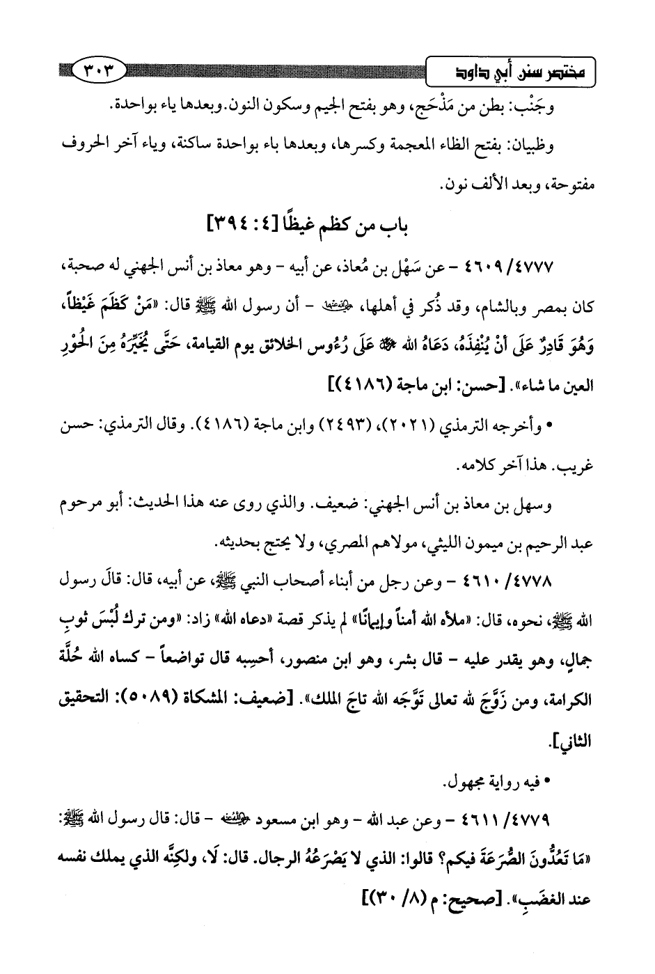4777/ 4609 - عن سَهْل بن مُعاذ، عن أبيه -وهو معاذ بن أنس الجهني له صحبة، كان بمصر وبالشام، وقد ذُكر في أهلها، -رضي اللَّه عنهما- أن رسول اللَّه -صلى اللَّه عليه وسلم- قال: "مَنْ كظَمَ غَيْظًا، وَهُوَ قَادِرٌ عَلَى أنْ يُنْفِذَهُ، دَعَاهُ اللَّه -صلى اللَّه عليه وسلم- عَلَى رُءُوس الخلاتق يوم القيامة، حَتَّى يُخَيِّرَهُ مِنَ الحُوْرِ العين ما شاء".hحسن: ابن ماجة (4186)]