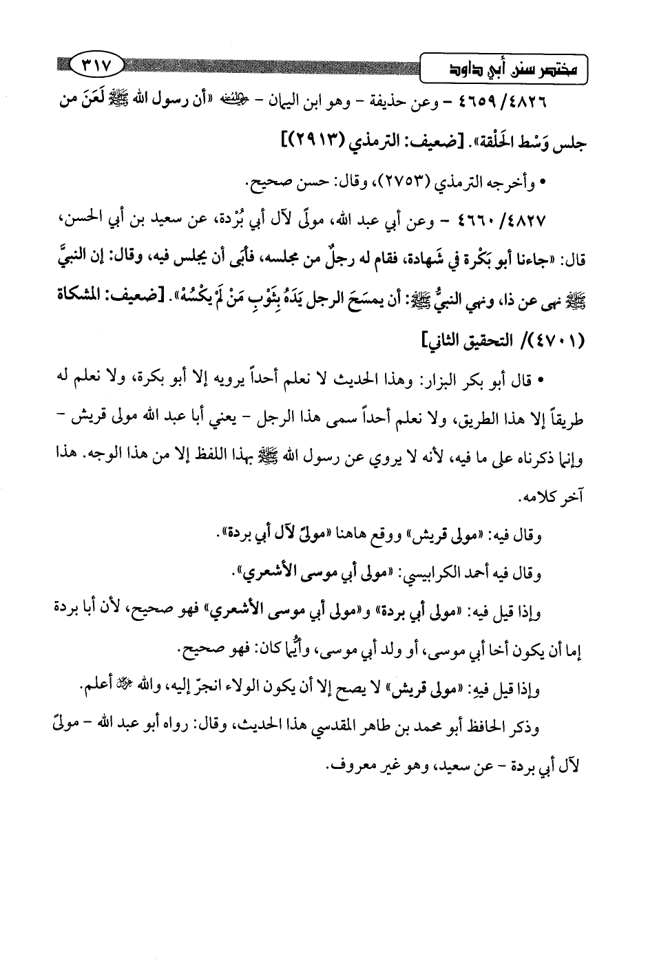 • قال أبو بكر البزار: وهذا الحديث لا نعلم أحدًا يرويه إلا أبو بكرة، ولا نعلم له طريقًا إلا هذا الطريق، ولا نعلم أحدًا سمى هذا الرجل -يعني أبا عبد اللَّه مولى قريش- وإنما ذكرناه على ما فيه، لأنه لا يروي عن رسول اللَّه -صلى اللَّه عليه وسلم- بهذا اللفظ إلا من هذا الوجه. هذا آخر كلامه.