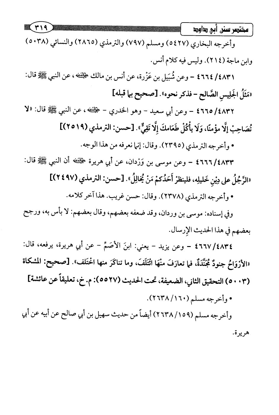 4832/ 4665 - وعن أبي سعيد -وهو الخدري -رضي اللَّه عنه-، عن النبي -صلى اللَّه عليه وسلم- قال: "لا تُصَاحِبْ إلَّا مؤْمنًا، وَلَا يأكُلْ طَعَامكَ إِلَّا تَقِيٌّ".hحسن: الترمذي (2519)]