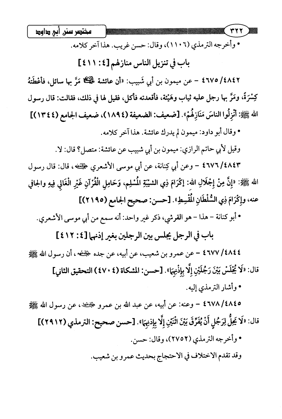 4844/ 4677 - عن عمرو بن شعيب، عن أبيه، عن جده -رضي اللَّه عنهم-، أن رسول اللَّه -صلى اللَّه عليه وسلم- قال: "لَا يُجْلَسْ بَيْنَ رَجُلَيْنِ إِلَّا بِإِذْنِهَما".hحسن: المشكاة (4754) التحقيق الثاني]