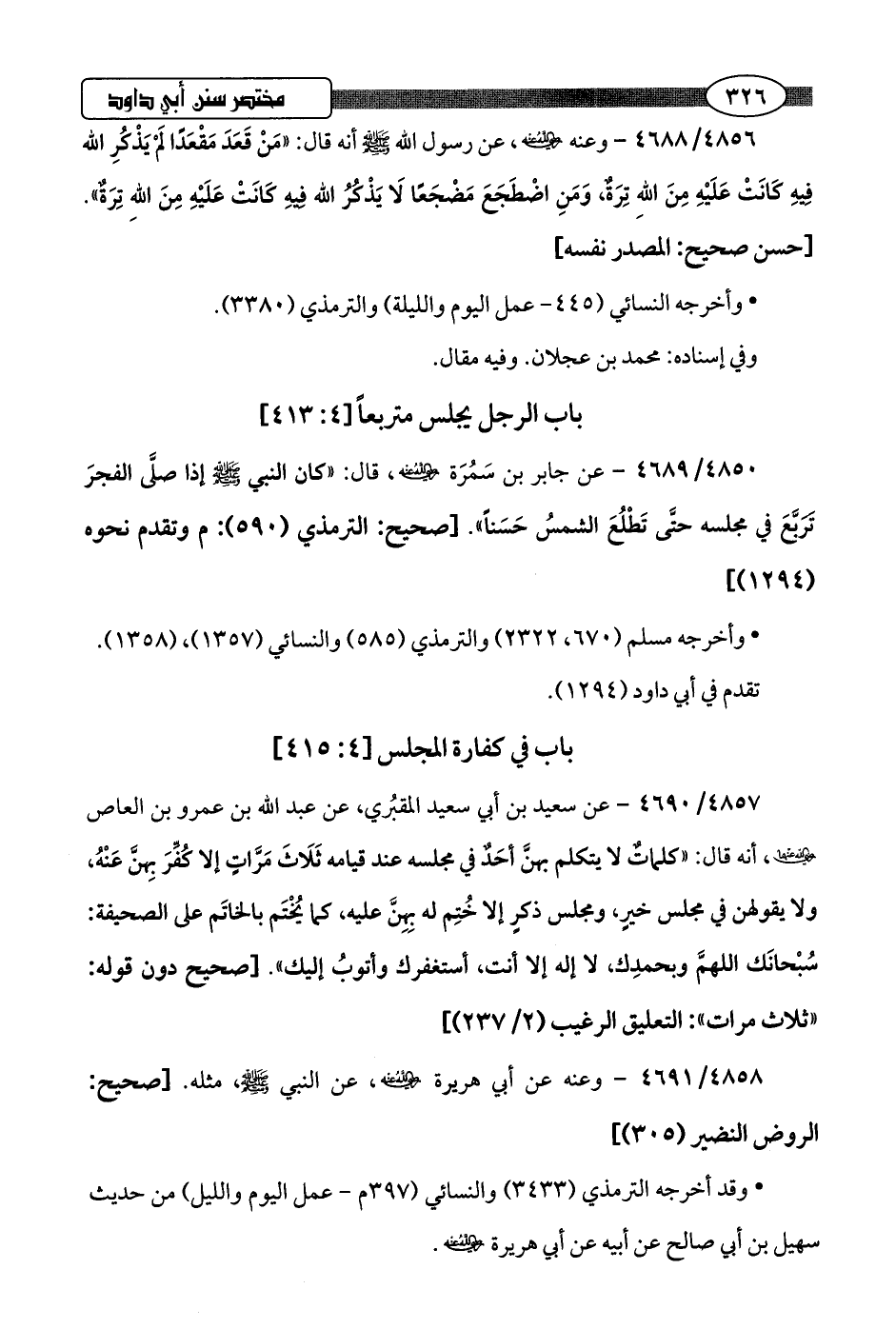 4850/ 4689 - عن جابر بن سَمُرَة -رضي اللَّه عنه-، قال: "كان النبي -صلى اللَّه عليه وسلم- إذا صلَّى الفجرَ تَرَبَّعَ في مجلسه حتَّى تَطْلُعَ الشمسُ حَسَنًا".hصحيح: الترمذي (595): م وتقدم نحوه (1294)]