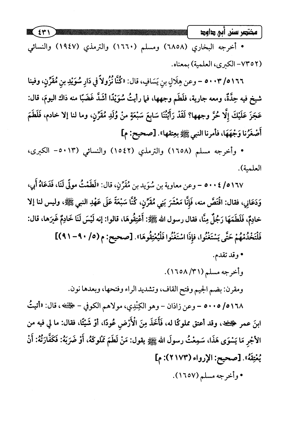 5167/ 5004 - وعن معاوية بن سُوَيد بن مُقَرِّنٍ، قال: "لَطَمْتُ مولًى لَنَا، فَدَعَاهُ أَبي، وَدَعَانِي، فقال: اقْتَصَّ منه، فَإِنَّا مَعْشَرَ بَني مُقَرِّنٍ، كُنَّا سَبْعَة عَلَى عَهْدِ النبي -صلى اللَّه عليه وسلم-، وليس لنا إلا خادِمٌ، فَلَطَمَهَا رَجُلٌ مِنَّا، فقال رسول اللَّه -صلى اللَّه عليه وسلم-: أَعْتِقُوهَا، قالوا: إنه لَيْسَ لنَا خَادِمٌ غَيرَها، قال: فَلْتَخْدُمْهُمْ حَتَّى يَسْتَغْنُوا، فإِذَا اسْتَغْنُوا فَلْيُعْتِقُوهَا".hصحيح: م (5/ 90 - 91)]