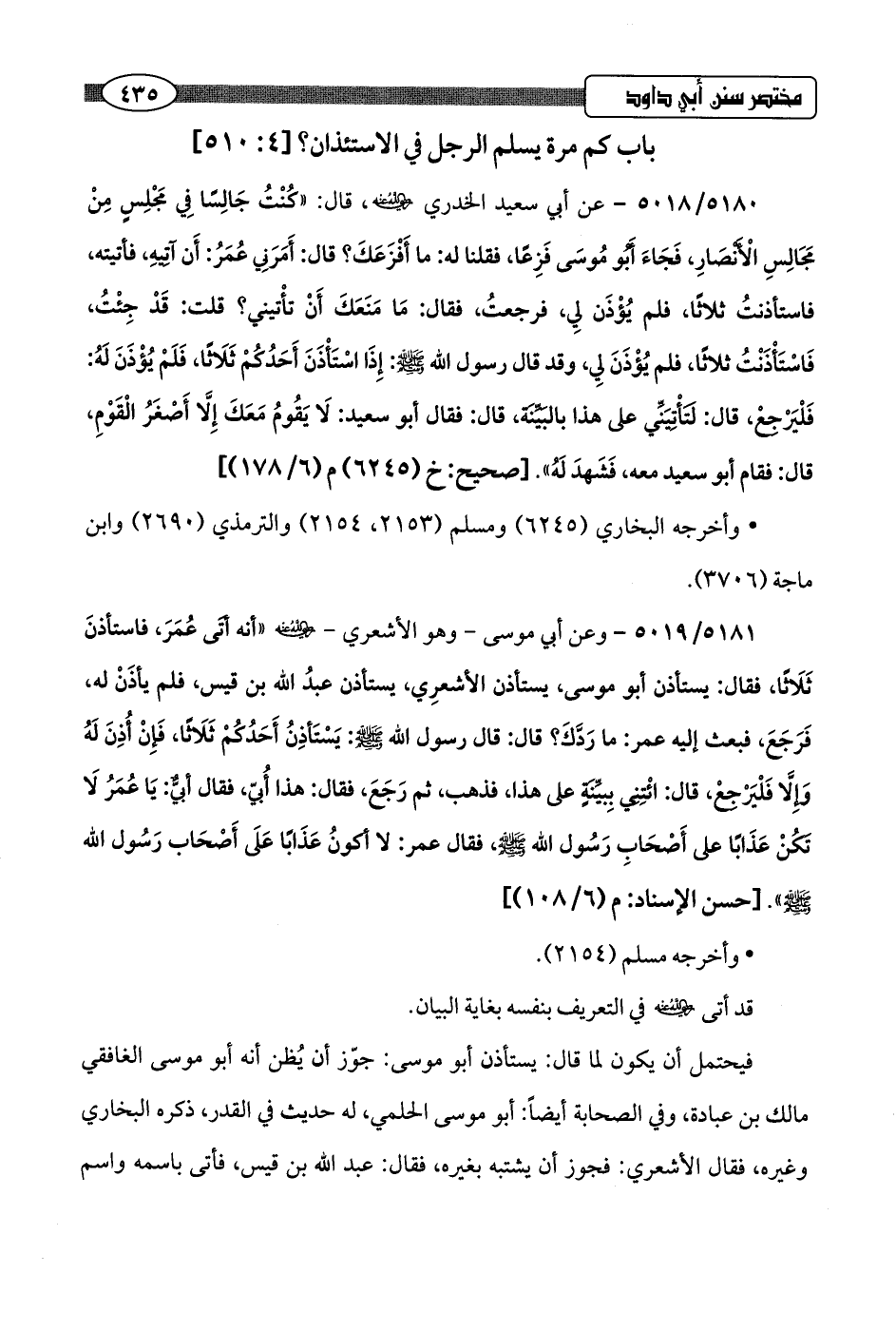 5181/ 5019 - وعن أبي موسى -وهو الأشعري -رضي اللَّه عنه- "أنه أتَى عُمَرَ، فاستأذنَ ثَلاثًا، فقال: يستأذن أبو موسى، يستأذن الأشعرِي، يستأذن عبدُ اللَّه بن قيس، فلم يأذَنْ له، فَرَجَعَ، فبعث إليه عمر: ما رَدَّكَ؟ قال: قال رسول اللَّه -صلى اللَّه عليه وسلم-: يَسْتَأذِنُ أَحَدُكُمْ ثَلاثًا، فَإِنْ أُذِنَ لَهُ وَإِلَّا فَلْيَرْجعْ، قال: ائْتِني بِبيِّنَةٍ على هذا، فذهب، ثم رَجَعَ، فقال: هذا أُبيّ، فقال أبيٌّ: يَا عُمَرُ لَا تكُنْ عَذَابًا على أَصْحَابِ رَسُول اللَّه -صلى اللَّه عليه وسلم-، فقال عمر: لا أكونُ عَذَابًا عَلَى أَصْحَاب رَسُول اللَّه -صلى اللَّه عليه وسلم-".hحسن الإسناد: م (6/ 108)]