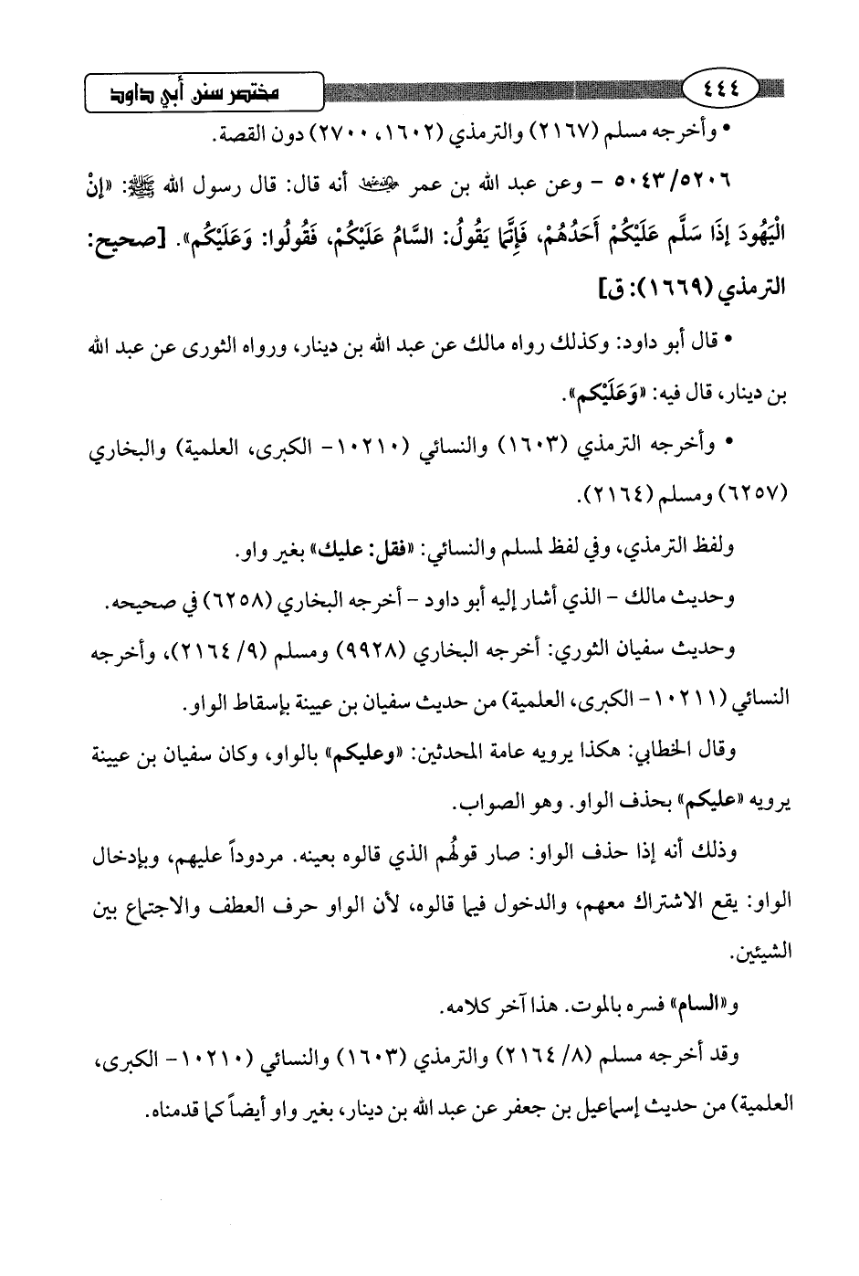 5206/ 5043 - وعن عبد اللَّه بن عمر -رضي اللَّه عنهما- أنه قال: قال رسول اللَّه -صلى اللَّه عليه وسلم-: "إنْ الْيَهُودَ إذَا سَلَّم عَلَيْكُمْ أَحَدُهُمْ، فَإِنَّمَا يَقُولُ: السَّامُ عَلَيْكُمْ، فَقُولُوا: وَعَلَيْكُم".hصحيح: الترمذي (1669): ق]