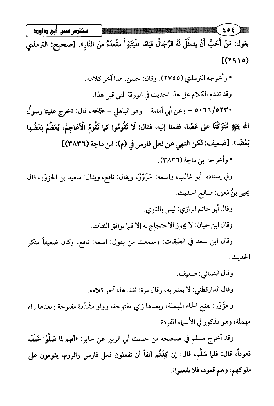 5230/ 5066 - وعن أبي أمامة -وهو الباهلي -رضي اللَّه عنه-، قال: "خرج علينا رسولُ اللَّه -صلى اللَّه عليه وسلم- مُتَوَكَّئًا على عَصًا، فقمنا إليه، فقال: لَا تَقُومُوا كما تَقُومُ الْأَعَاجِمُ، يُعَظِّمُ بَعْضُها بَعْضًا".hضعيف: لكن النهي عن فعل فارس في (م): ابن ماجة (3836)]