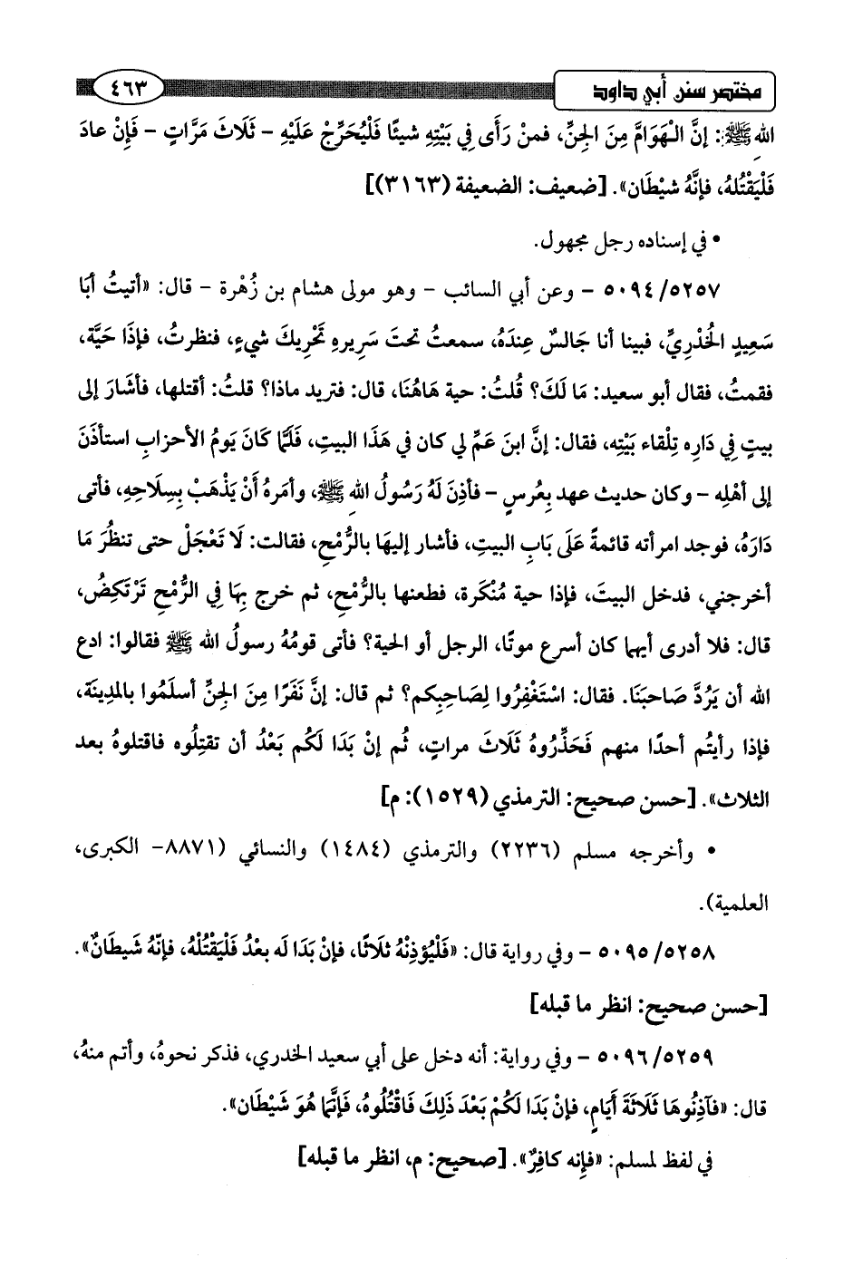 5257/ 5094 - وعن أبي السائب -وهو مولى هشام بن زُهْرة- قال: "أتيتُ أبَا سَعِيدٍ الخُدْرِيِّ، فبينا أنا جَالسٌ عِندَهُ، سمعتُ تحتَ سَرِيرهِ تَحْرِيكَ شيءٍ، فنظرتُ، فإذَا حَيَّة، فقمتُ، فقال أبو سعيد: مَالَكَ؟ قُلتُ: حية هَاهُنَا، قال: فتريد ماذا؟ قلتُ: أقتلها، فأشَارَ إلى بيتٍ فِي دَارِه تِلْقاء بَيْتِه، فقال: إنَّ ابنَ عَمِّ لي كان في هَذَا البيتِ، فَلَمَّا كَانَ يَومُ الأحزابِ استأذَنَ إلى أهْلِه -وكان حديث عهد بِعُرسٍ- فأذِنَ لَهُ رَسُولُ اللَّهِ -صلى اللَّه عليه وسلم-، وأمَرهُ أَنْ يَذْهَبْ بِسِلَاحِهِ، فأتى دَارَهُ، فوجد امرأته قائمةً عَلَى بَابِ البيتِ، فأشار إليهَا بالرُّمْحِ، فقالت: لَا تَعْجَلْ حتى تنظُرَ مَا أخرجني، فدخل البيتَ، فإذا حية مُنكَرة، فطعنها بالرُّمْحِ، ثم خرج بِهَا فِي الرُّمْحِ تَرْتَكِضُ، قال: فلا أدرى أيهما كان أسرع موتًا، الرجل أو الحية؟ فأتى قومُهُ رسولُ اللَّه -صلى اللَّه عليه وسلم- فقالوا: ادع اللَّه أن يَرُدَّ صَاحبَنَا. فقال: استَغْفِرُوا لِصَاحِبِكم؟ ثم قال: إن نَفَرًا مِنَ الجِنِّ أسلَمُوا بالمدِينة، فإذا رأيتُم أحدًا منهم فَحَذِّرُوهُ ثَلَاثَ مراتٍ، ثُم إنْ بَدَا لكُم بَعْدُ أن تقتِلُوه فاقتلوهُ بعد الثلاث".hحسن صحيح: الترمذي (1529): م]