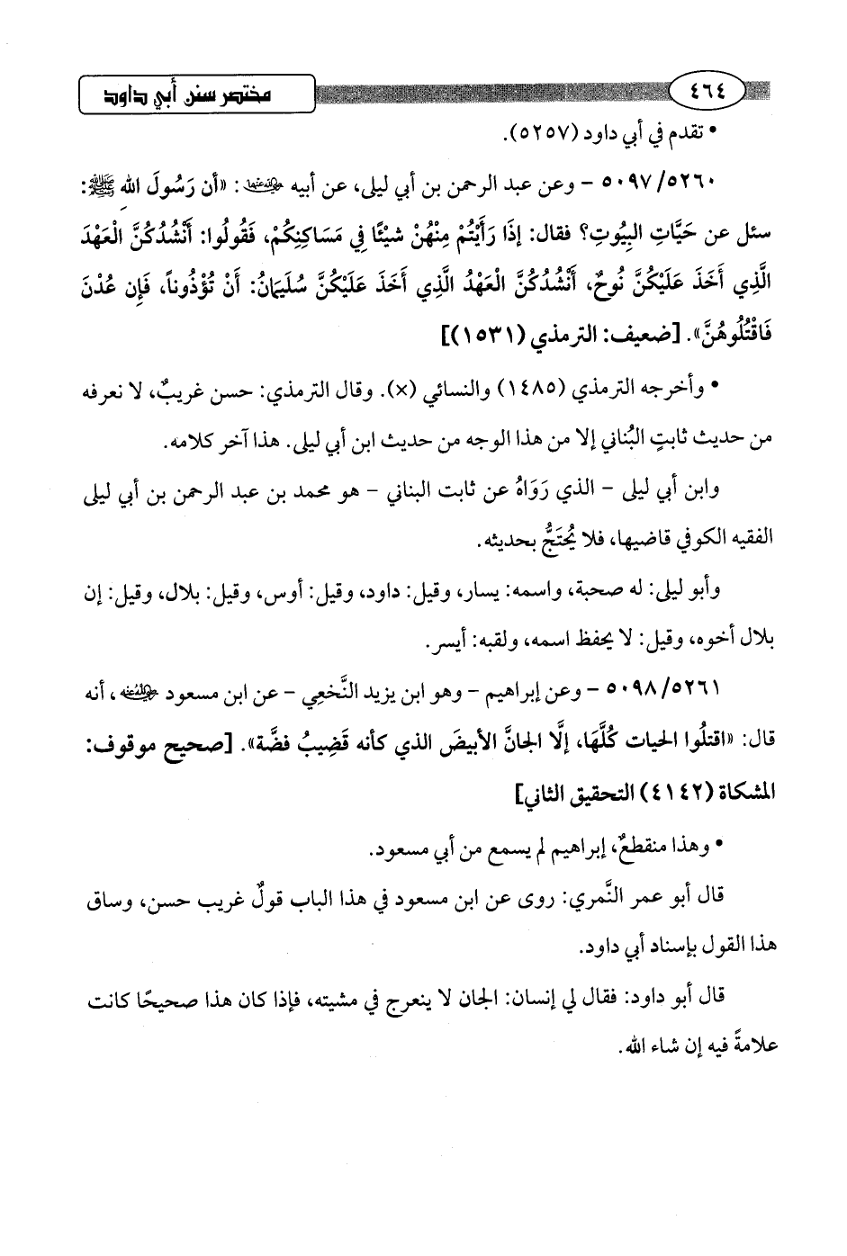 5260/ 5097 - وعن عبد الرحمن بن أبي ليلى، عن أبيه -رضي اللَّه عنهما-: "أن رَسُولَ اللَّهِ -صلى اللَّه عليه وسلم-: سئل عن حَيَّاتِ البِيُوتِ؟ فقال: إذَا رَأَيْتُمْ مِنْهُنْ شيْئًا فِي مَسَاكنِكُمْ، فَقُولُوا: أَنْشُدُكُنَّ الْعَهْدَ الَّذِي أَخَذَ عَلَيْكُنَّ نُوحٌ، أَنْشُدُكُنَّ الْعَهْدُ الَّذِي أَخَذَ عَلَيْكُنَّ سُلَيمَانُ: أَنْ تُؤْذُونًا، فَإِن عُدْنَ فَاقْتُلُوهُنَّ".hضعيف: الترمذي (1531)]