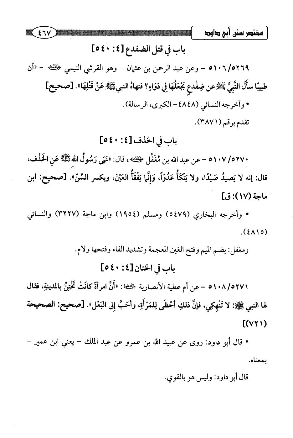 5270/ 5107 - عن عبد اللَّه بن مُغَفَّل -رضي اللَّه عنه-، قال: "نَهَى رَسُولُ اللَّهِ -صلى اللَّه عليه وسلم- عَنِ الخَذْف، قال: إنه لا يَصيدُ صَيْدًا، ولا يَنْكَأُ عَدُوًّا، فيِنَّما يَفْقَأُ العَيْنَ، ويكسر السِّنّ".hصحيح: ابن ماجة (17): ق]
