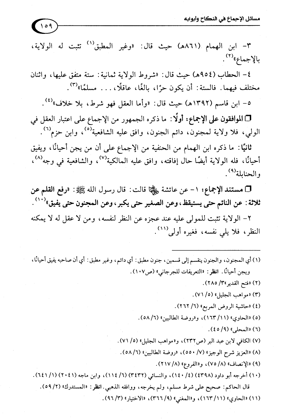 5 - ابن قاسم (1392 هـ) حيث قال: "وأما العقل فهو شرط، بلا خلاف" (¬4).