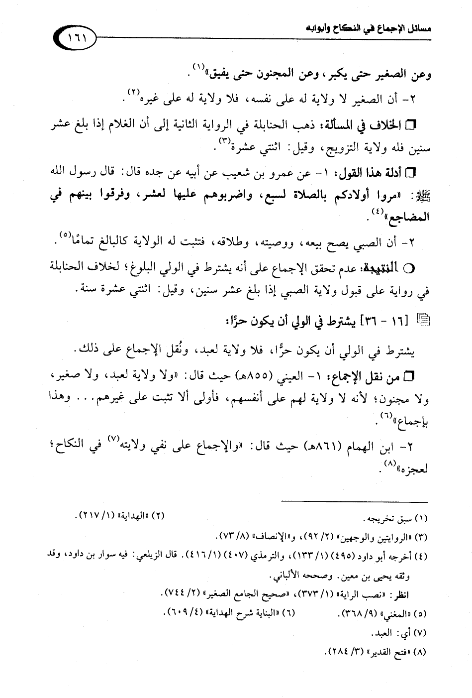 2 - ابن الهمام (861 هـ) حيث قال: "والإجماع على نفي ولايته (¬7) في النكاح؛ لعجزه" (¬8).