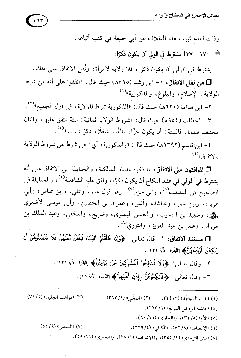 4 - ابن قاسم (1392 هـ) حيث قال: "والذكورية، أي: هي شرط من شروط الولاية بالاتفاق" (¬4).
