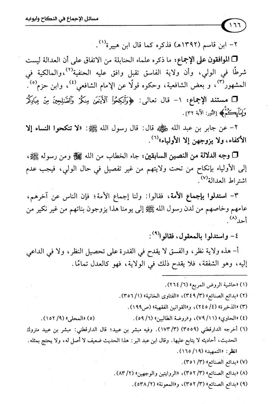 • الموافقون على الإجماع: ما ذكره علماء الحنابلة من الاتفاق على أن العدالة ليست شرطًا في الولي، وأن ولاية الفاسق تقبل وافق عليه الحنفية (¬2)، والمالكية في المشهور (¬3)، وبعض الشافعية، وحكوه قولًا عن الإمام الشافعي (¬4)، وابن حزم (¬5).