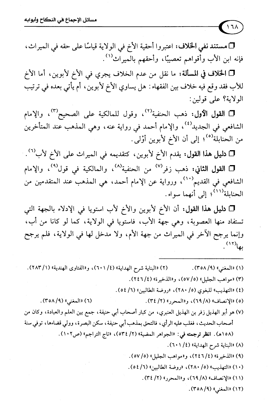 • مستند نفي الخلاف: اعتبروا أحقية الأخ في الولاية قياسًا على حقه في الميراث، فإنه ابن الأب وأقواهم تعصيبًا، وأحقهم بالميراث (¬1).