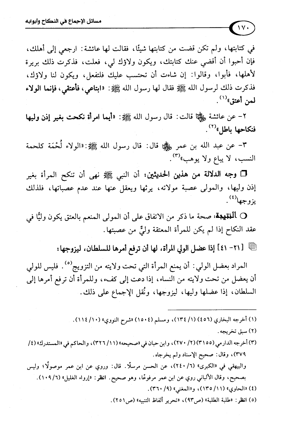 • وجه الدلالة من هذين الحديثين: أن النبي -صلى اللَّه عليه وسلم- نهى أن تنكح المرأة بغير إذن وليها، والمولى عصبة مولاته، يرثها ويعقل عنها عند عدم عصباتها، فلذلك يزوجها (¬4).Rصحة ما ذكر من الاتفاق على أن المولى المنعم بالعتق يكون وليًّا في عقد النكاح إذا لم يكن للمرأة المعتقة وليٌّ من عصبتها.